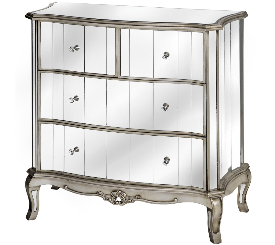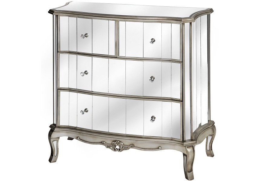 Elegantná a ozdobná zrkadlová komoda s piatimi zásuvkami bude neprehliadnuteľným prvkom vášho interiéru.