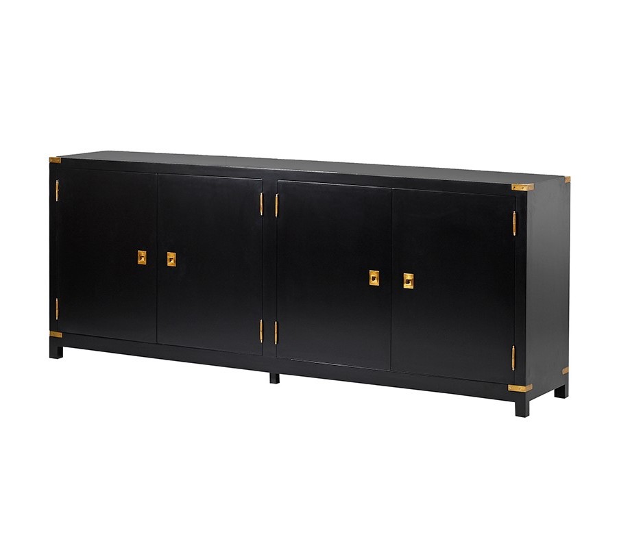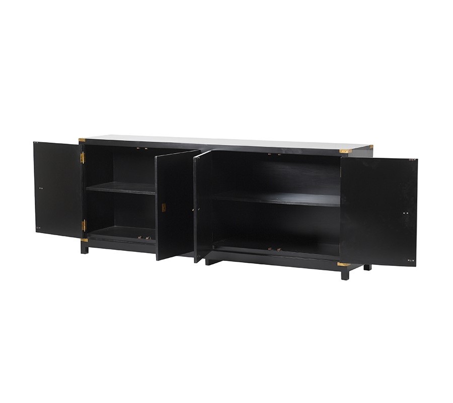 Art-deco luxusný príborník Wielton Oro čierny je vyrobená z dreveného masívu. Povrch príborníka je matný, hladký na dotyk. Prvky v zlatej farbe vytvárajú efekt spojov. Ako ukladací priestor poslúžia štyri krídla s dostakom miesta. Poslúži na uskladnenie bielizne, drobností. Dá sa využiť aj ako komoda. Kombinovať sa dá v štýle art-deco, poprípade farebne zladiť s bielou, šedou.