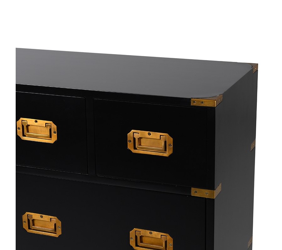 Art-deco luxusná komoda Wielton Oro v čiernom prevedení je vyrobená z prírodného dreveného masívu. Pre uloženie bielizne a drobností poslúži sedem zásuviek, ktoré majú zlatú farbu rúčky. Túto komodu obohacujú zlaté doplnky, ktoré vytvárajú spoje. Komoda je mierne nazdvihnutá nad zemou, čo uľahčí upratovanie. Komoda pôsobí skvostne.
