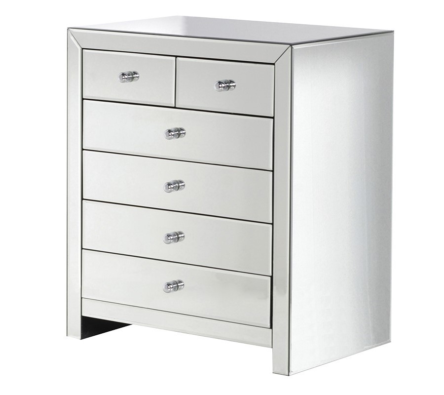 Jedinečná a nadčasová komoda z našej kolekcie luxusného nábytku Ismay je exkluzívnou ukážkou zrkadlového štýlu, ktorý je dnes v modernom bývaní veľmi obľúbený. Klasický obdĺžnikový tvar výborne zapadne do vašej spálne alebo obývačky. Štyri väčšie a dve menšie praktické zásuvky disponujú dostatočne veľkým úložným priestorom a vrchnú plochu tiež možno využiť na rôzne dekoračné predmety. Doplnky možno voliť v rôznych farbách. Taktiž odporúčame kombinovať s ďalšími produktami z našej kolekcie Ismay.