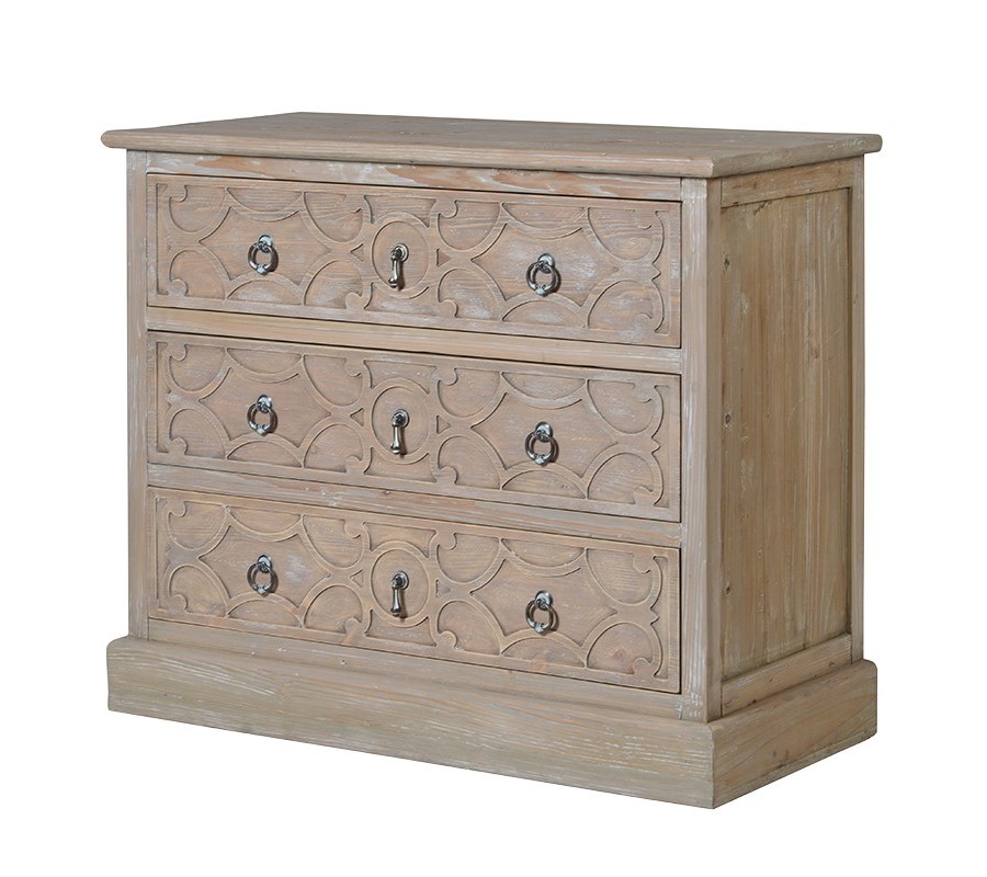 Zámocká luxusná komoda Karlotta je vyrobená z prírodného dreveného masívu a má svetlohnedú farbu. Ako ukladací priestor pre Vaše veci poslúžia 3 veľké zásuvky, ktoré sú dozdobené ornamentami a kovovými rúčkami. Povrch je opracovaný bielymi škvrnami, ktoré dodávajú šarm tejto komode. Najlepšou a vhodnou kombináciou by boli interiéry zladené v zámockom štýle. Komoda pôsobí jednoliato, preto je potrebné k nej doplniť nejáké kontrastné prvky, ktoré zvýraznia jej elegantnosť.