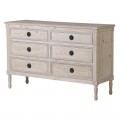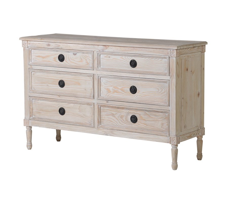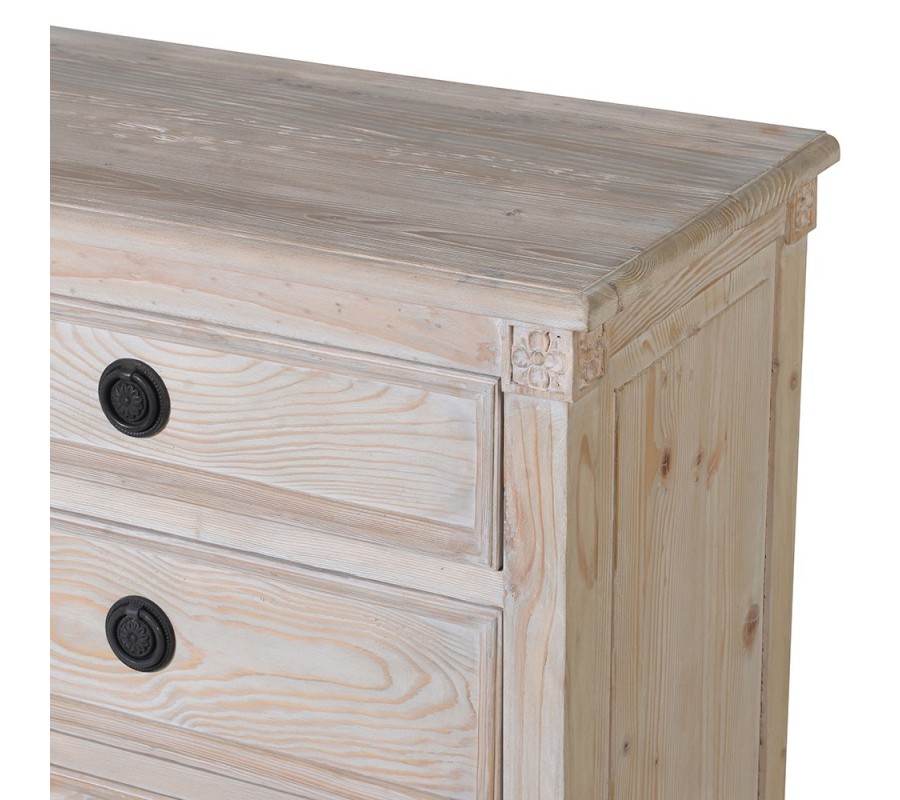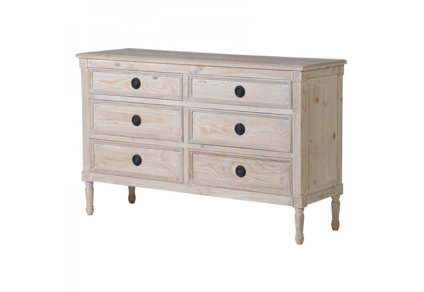 Rustikálna luxusná komoda Karlotta je vyrobená z prírodneho dreveného masívu v svetlohnedom prevedení. Komoda je zložená zo šiestich zásuviek, ktoré dokonalo vytvárajú dostatočne veľký ukladací priestor. Povrch zásuviek dopĺňajú kovové rúčky v čiernej farbe a vintage prevedení. Svojimi vyrezávanými prvkami zapadne do každého rustikálne, vidiecky zariadeného interiéru. Veľkou výhodou sú vysoké nožičky, ktoré umožňujú ľahšie upratovanie pod komodou. Celkovo pôsobí elegantne a doplní Vašu spálňu.