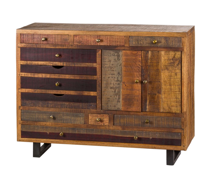 Jedinečný industriálny príborník Coleto vás na prvý pohľad zaujme svojím nevšedným dizajnom. Je vyrobený z recyklovaného dreva, je teda skvelou voľbou pre všetkých, ktorým záleží na ekológii. Pôsobí veľmi zaujímavo a originálne aj vďaka množstvu zásuviek a dvierok, ktoré vám poslúžia na uskladnenie menších či väčších predmetov.Dizaj je doplnený rukoväťami v zlatej farbe a čiernymi kovovými nožičkami. Príborník Coleto možno využiť v jedálni či v obývačke ako skrinku alebo komodu. Vášmu domovu dodá starobylý či vidiecky nádych. Skvelo vynikne v kombinácii s industriálnymi kúskami a farbami prírodných či zlatých odtieňov.