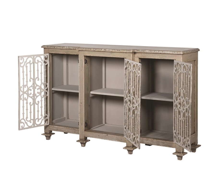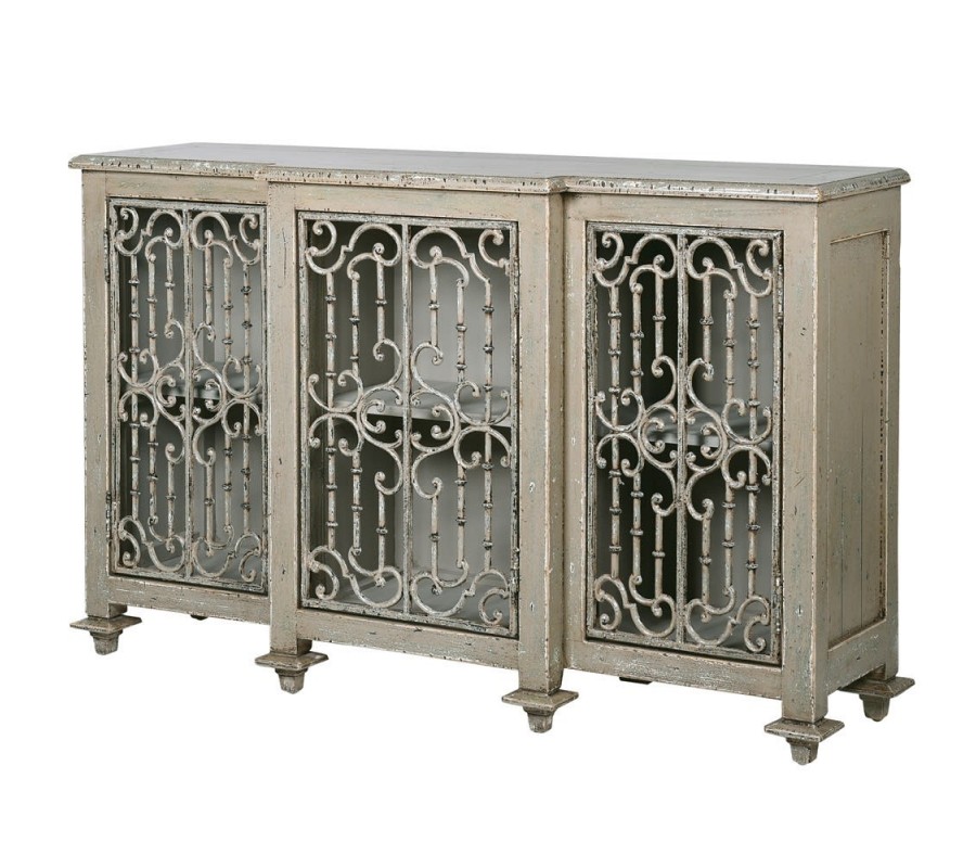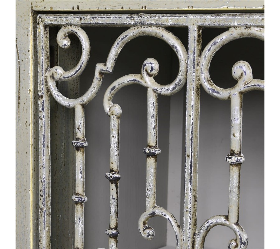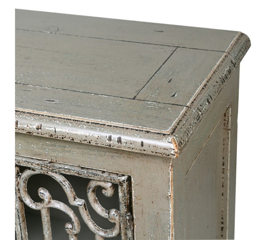 Skrinka Fraulen vyniká naozaj výrazným ošúchaným povrchom typickým pre obľúbený štýl vintage. Kombinuje borovicové drevo na odkladacej časti skrinky so železnými ornamentálnymi dvierkami. Skrinka je rozdelená na tri časti s úložným priestorom, v ktorých sú dve úrovne poličiek na odkladanie rozličných predmetov. Keďže trojica dvierok pozostáva zo železnej ornamentálnej mriežky, objekty uložené na poličkách zostávajú z časti viditeľné. Ošúchaný vzhľad povrchu vo vintage štýle je vhodné kombinovať s čalúnením nábytku a doplnkov v prírodných textíliách. Skrinku Fraulen môžete kombinovať s ošúchaným vzhľadom vintage nábytku či s dreveným nábytkom s vidieckym nádychom. Skrinku je vhodné umiestniť kdekoľvek vo vašom interiéri, krásne vynikne v spoločných priestoroch obývačiek, jedálni a chodieb, hodí sa aj do romantickej spálne vo vintage štýle či ako úložný priestor na uteráky do kúpelní.