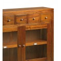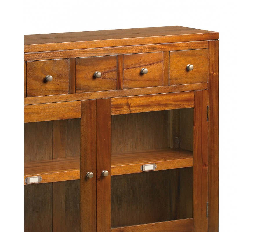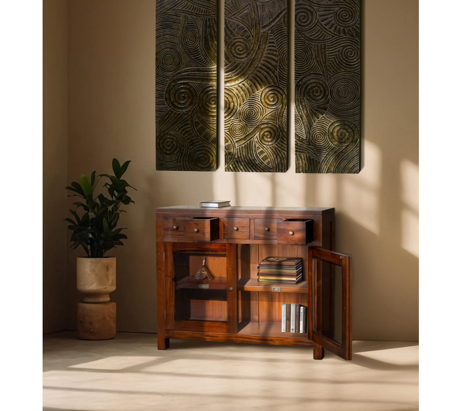 Luxusná jedinečná konzola z kolekcie FLAMINGO je vyrobená z dreva CAOBA (Mahagón) s čerešňovou povrchovou úpravou, so zachovanou štruktúrou masívneho dreva v koloniálnom štýle. Disponuje praktickými zásuvkami v hornej časti a poličkami so sklenenými dvierkami, ktoré umožnia prakticky a šetrne vystaviť všetky vami želané predmety. Konzola Flamingo vďaka svojmu prevedeniu vynikne najmä v kombinácii s bielymi stenami a masívnym nábytkom v luxusných predsieňach, chodbách či halách.