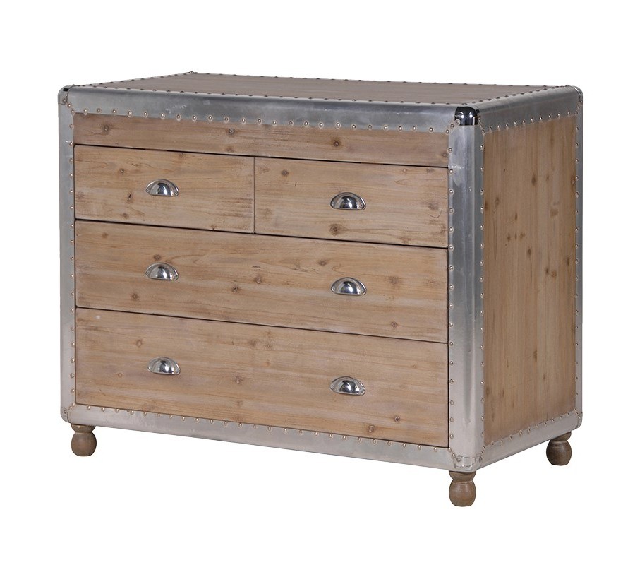 Industriálna drevená hnedá komoda Amberley so štyrmi zásuvkami na nožičkách so zdobením striebornej farby 100cm