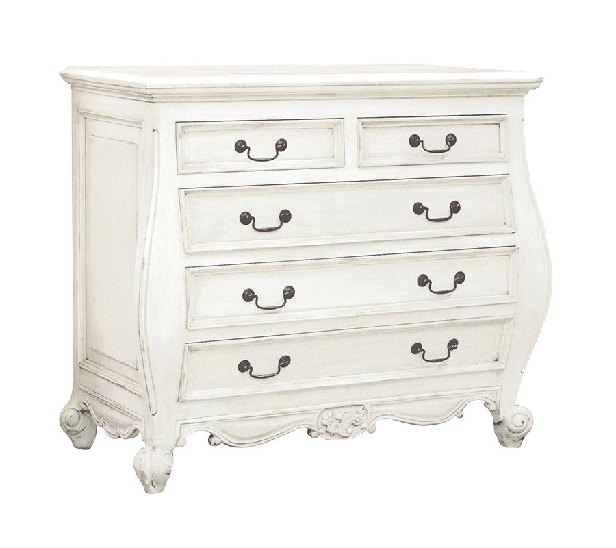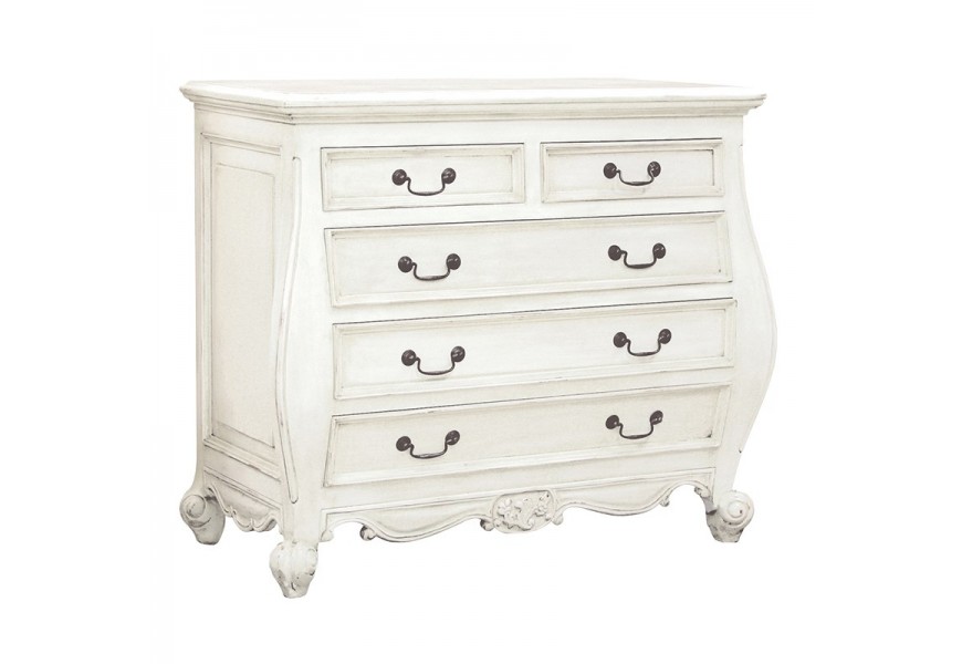 Luxusná komoda Antic Blanc navodí luxusnú atmosféru v každom priestore. Francúzský historický štýl je dekorovaný krásnymi zdobenými tvarmi, ktoré zjemní patinovaná biela farba. Je vyrobená z masivneho mahagonového dreva, čo zaručuje odolnosť tohto nábytku. Komoda pozostáva z 5 zásuviek.