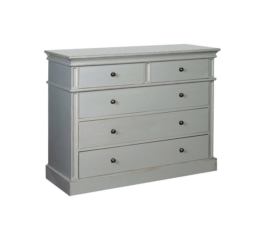 Štýlová komoda z kolekcie Riva Gris s piatimi zásuvkami, ktoré Vám poskytujú dostatok úložného priestoru, je vyrobená z masívneho topoľového dreva. Vďaka príjemným sivým odtieňom v kombinácii so zlatými prvkami osvieži Vás domov, síce sa jedná o kúsok vo vidieckom štýle, perfektne zapadne i do akéhokoľvek iného interiéru.