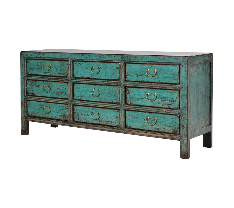 Štýlová vintage komoda Verda v tyrkysovom prevedení s deviatimi zásuvkami