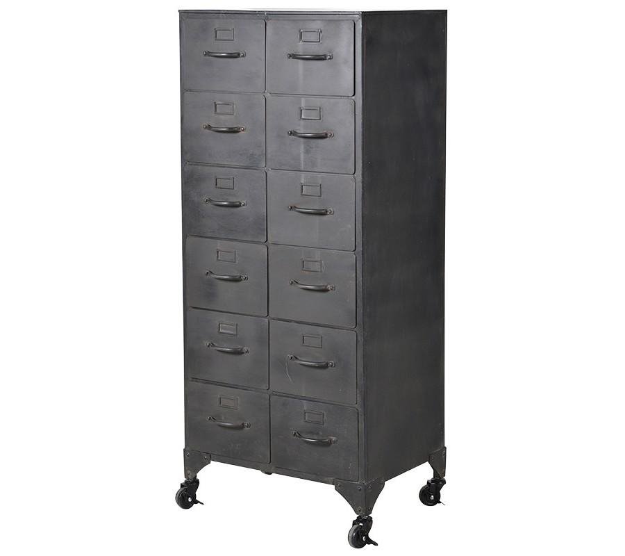 Industriálna vysoká komoda Carsen na kolieskach s dvanástimi zásuvkami čierna 116 cm