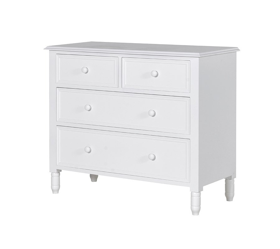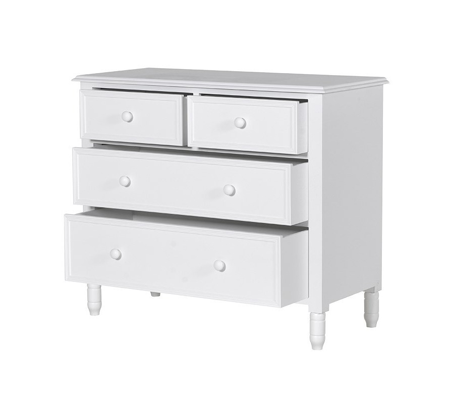 Štýlová provensálska komoda Blanc Clair so štyrmi zásuvkami sa stane elegantným doplnkom interiéru a zaistí dostatok úložného priestoru. Doplňte ju štýlovými kúskami z kolekcie nábytku Blanc Clair.