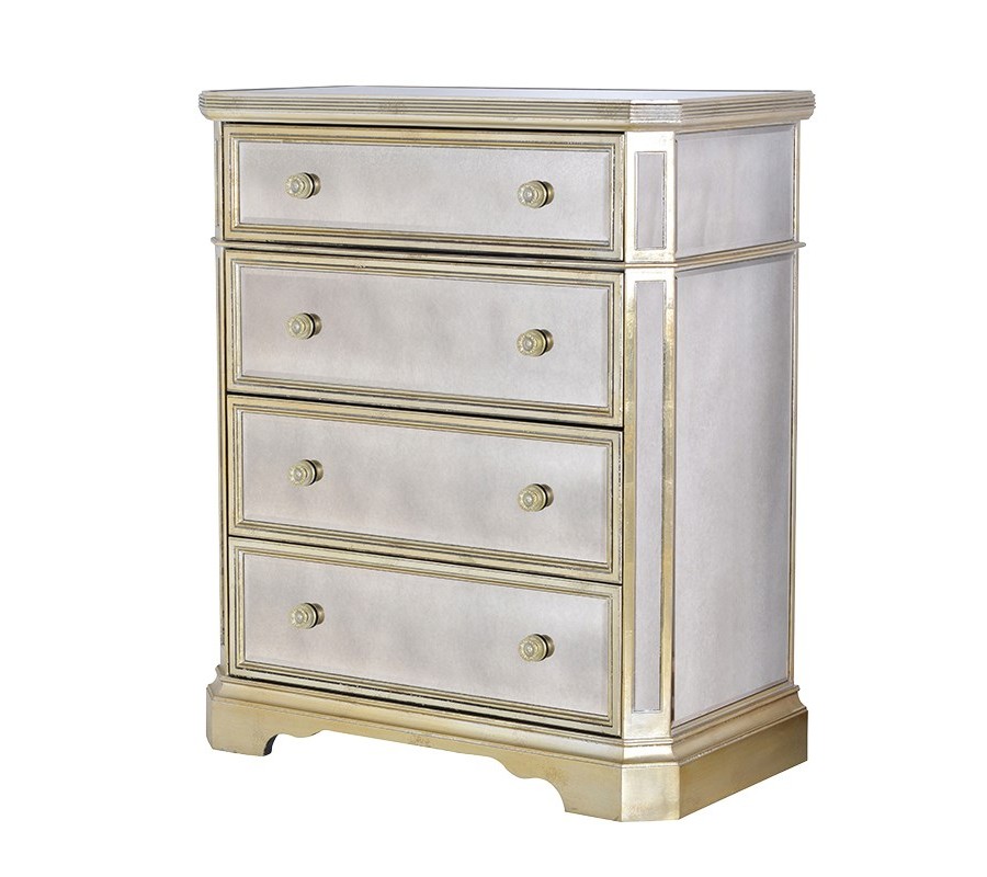 Zrkadlová komoda z kolekcie lukratívneho zrkadlového nábytku Granada Old Vás zaiste na prvý pohľad očarí svojimi strohými no zároveň veľmi čistými a jemnými líniami, ktoré v kombinácii s lesklými zrkadlovými plochami po celom jej povrchu príjemne otvárajú a prevzdušňujú priestor. Taktiež Vás poteší množstvom úložného priestoru, ktorý ukrýva v štyroch zásuvkách s neobyčajnými a štýlovými rukoväťami. Dizajnovým a pútajúcim aspektom je najmä antický vzhľad tejto štýlovej komody.