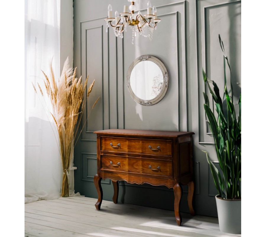 Exkluzívna komoda M-Vintage predstavuje štýlové prepojenie rustikálneho, koloniálneho a vintage štýlu. Na prvý pohľad zaujme najmä vďaka nádhernému vyrezávaniu v spodnej časti a na nožičkách, ktoré do vášho domova vnesie luxusný historický nádych. Komoda je vyrobená z masívneho mahagónového dreva v tmavohnedom odtieni, ktorý krásne vynikne najmä v svetlejšie ladených miestnostiach s bielymi stenami. Odporúčame taktiež tento kúsok doplniť o rôzne vintage doplnky či textílie v svetlých odtieňoch. Komoda disponuje dvomi tvarovanými zásuvkami s kovovými rukoväťami vhodnými na uskladnenie odevov či rôznych predmetov, podľa toho, či sa rozhodnete umiestniť ju v spálni, obývačke alebo inej miestnosti. Odporúčame taktiež kombináciu s ďalšími kúskami z našej luxusnej kolekcie M-Vintage.