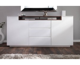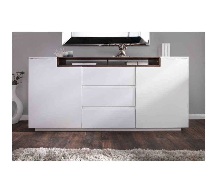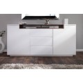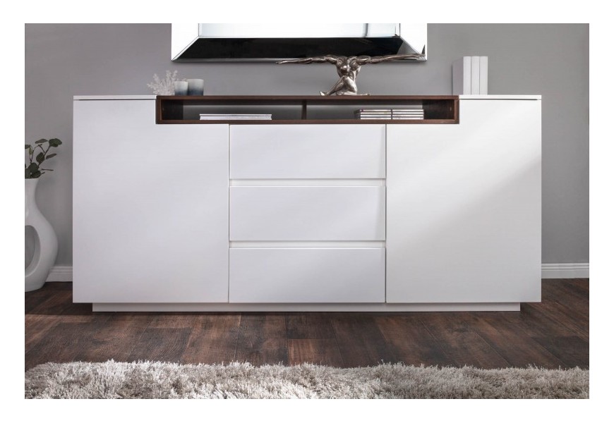 Štýlový príborník z našej modernej kolekcie Kingdom zaujme najmä vďaka svojmu minimalistickému spracovaniu. Matné biele prevedenie skvelo vynikne aj v tmavšie ladených jedálňach či obývačkách, kde môže pôsobiť ako výrazný a dominantný prvok. Zaujímavým kontrastom je otvorená polička v strede príborníka, ktorá sa nesie v hnedej farbe. Tento jednoduchý elegantný prvok príborník oživí a dodá mu dizajnový nádych. Príborník ďalej disponuje tromi zásuvkami a dvomi dvierkami po okrajoch, za ktorými sa nachádzajú ešte dve väčšie a jedna menšia polička na každej strane. Poskytne vám tak dostatok úložného priestoru. Príborník Kingdom skvelo vynikne v moderných priestoroch vašich jedální a obývačiek v kombinácii s hnedým či bielym nábytkom a výraznými dekoráciami.