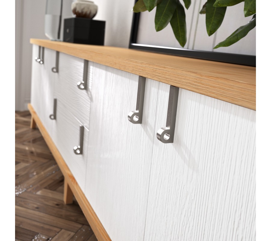 Luxusný TV stolík z kolekcie Sajonia je štýlovým a elegantným prepojením kvalitného materiálu, čistých, minimalistických línií a nadčasového dizajnu. Celý stolík je vyrobený z kvalitného masívneho dreva, výnimkou sú len kovové rukoväte na dvierkach a zásuvkách, ktoré tvoria k jednotnému vzhľadu akcentový prvok. Pri kúskoch z tejto kolekcie ponúkame možnosť voľby farebnosti, vďaka čomu si môžete vytvoriť kúsok presne podľa vašich predstáv, ktorý krásne zapadne do vášho interiéru. TV stolík disponuje dvomi priestrannými zásuvkami a poličkami s dvierkami. Vďaka univerzálnemu vzhľadu a úložnému priestoru možno tento kúsok využiť aj v obývačke či spálni ako komodu. Štýlové nožičky dopomôžu k lepšej manipulácii a zároveň dopĺňajú celkový moderný dizajn. Inšpirujte sa aj ďalšími kúskami z našej kolekcie Sajonia a zariaďte si tak obývačku presne podľa vašich predstáv!