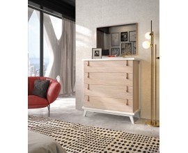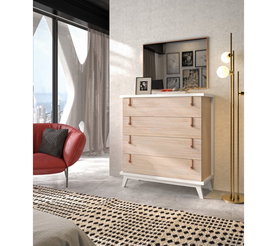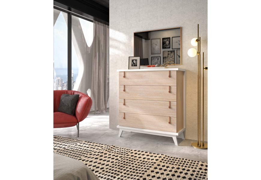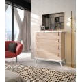 Moderná komoda Sajonia z našej rovnomennej kolekcie je unikátnym a nadčasovým kúskom, ktorý prepája eleganciu s jednoduchým dizajnom a funkčnosťou. Je vyrobená z kvalitného masívneho dreva v kombinácii s kovovými úchytmi na zásuvkách. Farbu celej komody alebo jej jednotlivých častí si môžete vybrať z ponúkaných odtieňov nášho vzorkovníka, vďaka čomu si môžete vytvoriť unikátny kúsok presne podľa vašich predstáv. Komoda Sajonia disponuje štyrmi priestrannými zásuvkami, ktoré poskytujú bohaté úložné miesto vhodné do vašej spálne či obývačky. Drevené nožičky dotvárajú moderný vzhľad a sú taktiež praktickým elementom pri upratovaní či manipulácii.