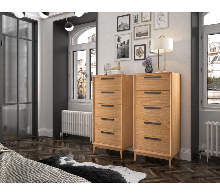 Jedinečná vysoká komoda Estoril je vyrobená z kvalitného masívneho dreva v rozličných odtieňoch. Okrem neutrálnych sivých, hnedých a bielych povrchov si môžete vybrať aj z odvážnejších farieb modrej, zelenej či žltej povrchovej úpravy. Masívny povrch je doplnený kovovými prvkami v troch odtieňoch, ktoré rešpektujú čistotu tvaru a nadčasový dizajn komody. Praktická komoda obsahuje päť priestranných zásuviek, ktoré môžete využiť ako odkladací priestor v spálni, obývačke, predsieni či kdekoľvek vo vašom interiéri. Vo vašej spálni sa bude vynímať v kombinácii s posteľou, nočnými stolíkmi a ďalšími prvkami našej rovnomennej kolekcie, ktorá je stelesnením mimoriadnej kvality s dôrazom na detail. Komodu môžete kombinovať s ďalšími prvkami kolekcie s úložným priestorom a vytvoriť tak vo svojom interiéri štýlovú celistvú atmosféru.