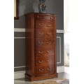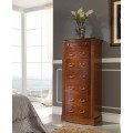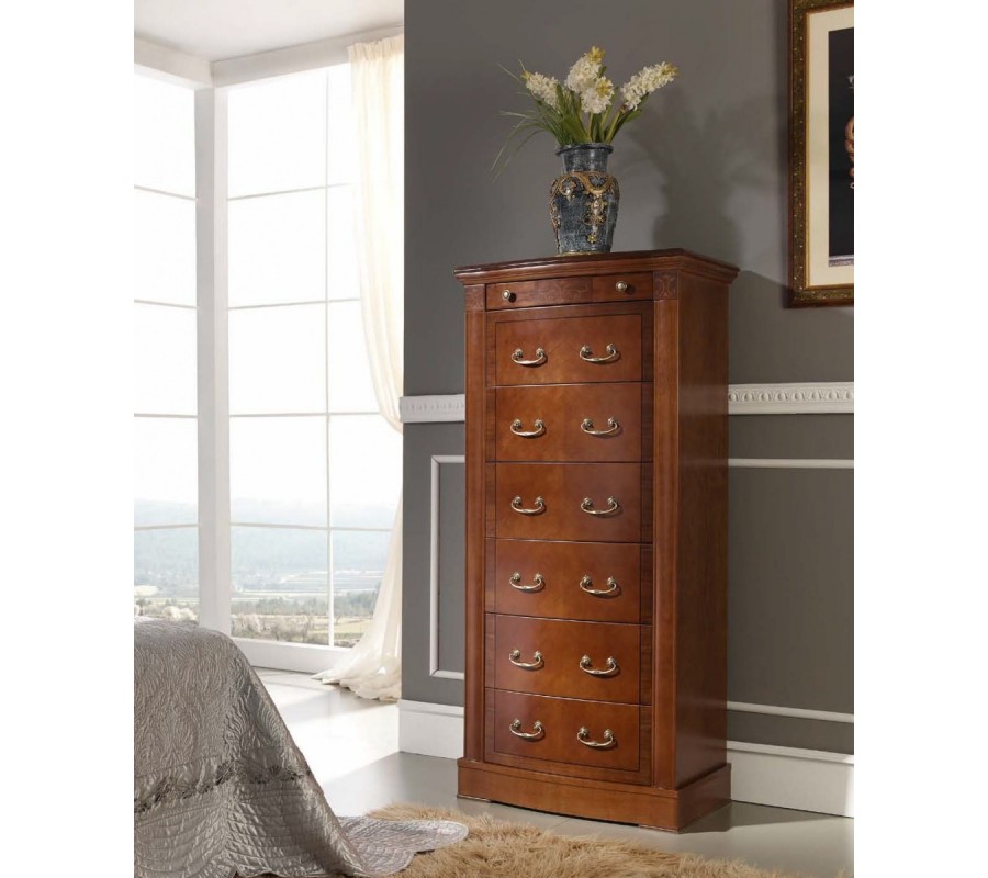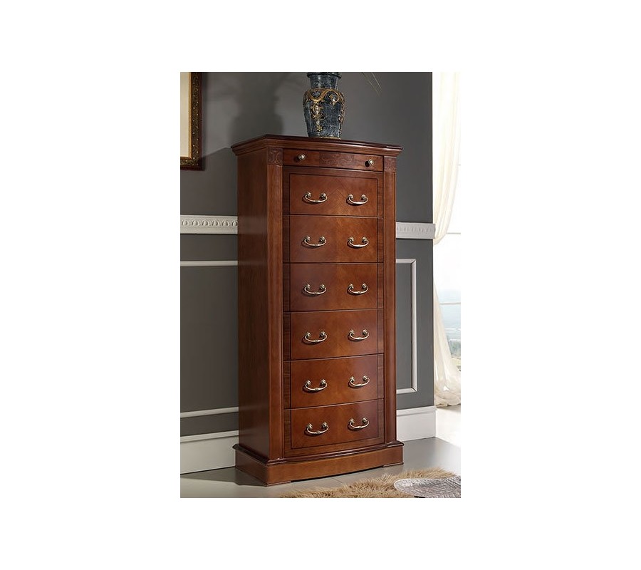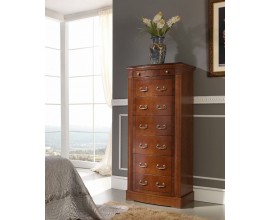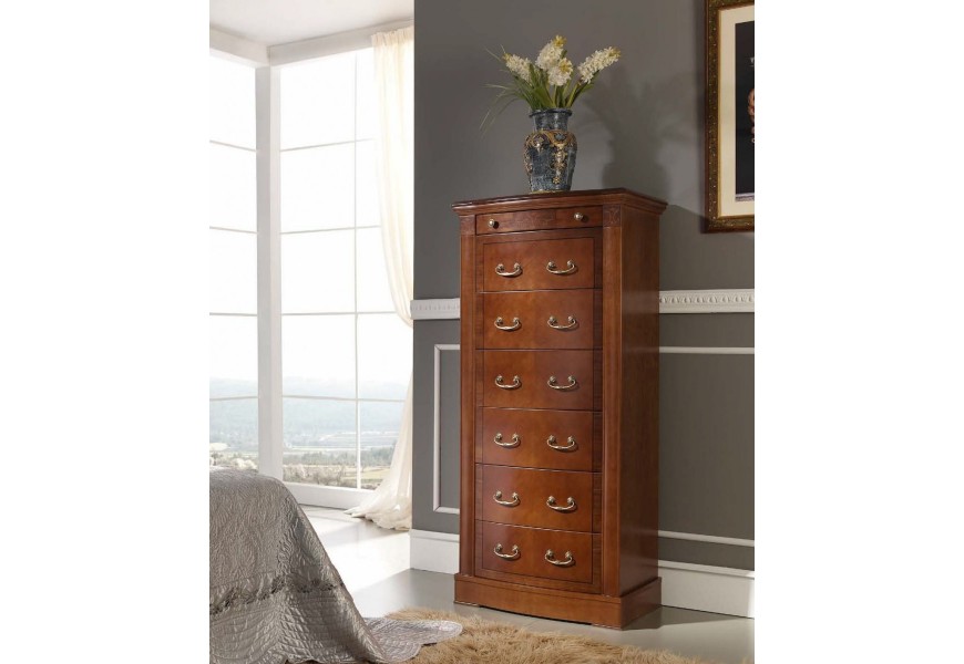 Exkluzívna vysoko kvalitná komoda z bukového masívu pripomína nábytok aristokracie z minulých storočí. Vďaka jej elegantnému farebnému prevedeniu a masívnemu dizajnu je vhodnou voľbou do väčšiny spální a interiérov. Komfortné množstvo úložného priestoru zabezpečuje 6 väčších a 1 menšia zásuvka. Množstvo detailov robí z tejto vysokej komody jedinečný rustikálny kus nábytku. Produkt na fotografií je vo farebnom prevedení orech.