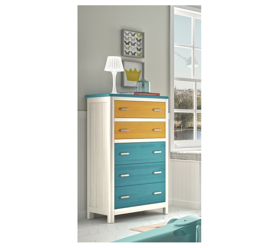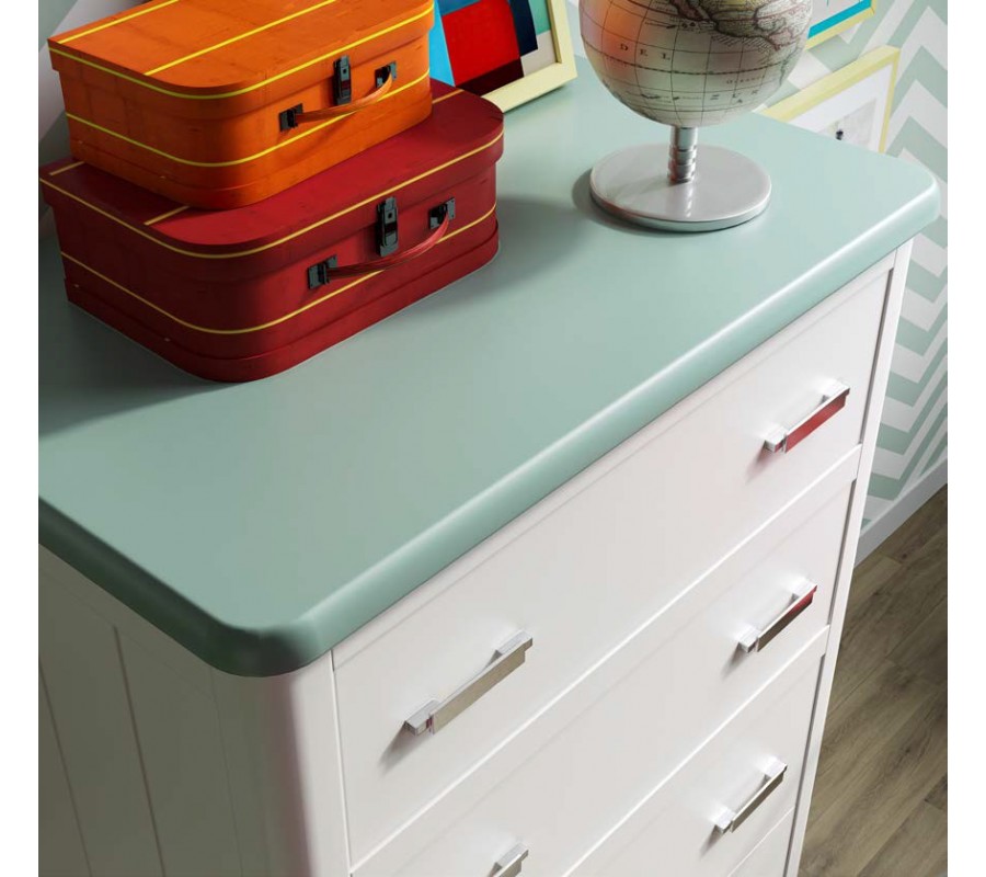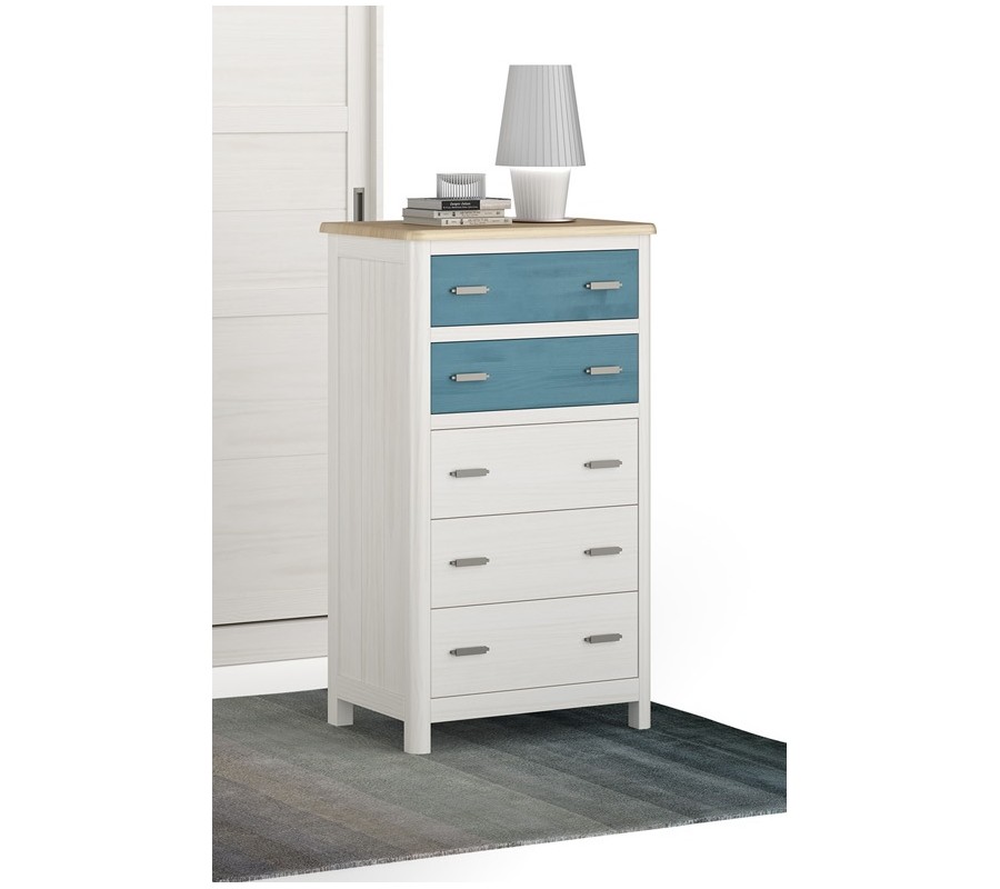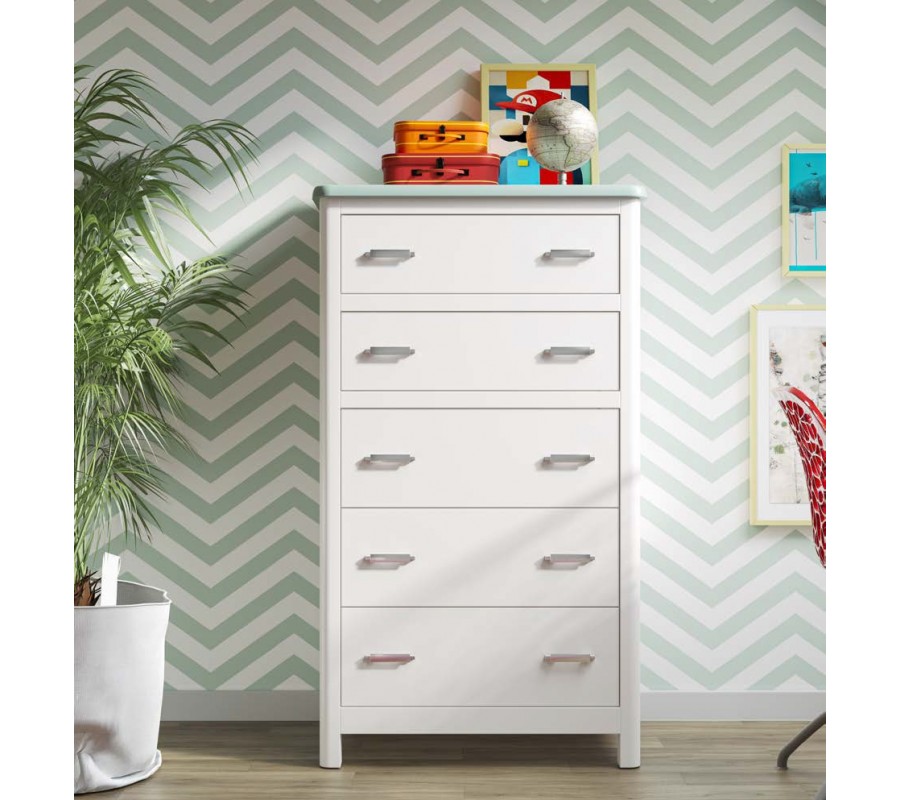 Komoda má obdĺžnikovú vrchnú dosku a vyššiu štíhlejšiu siluetu. Dominujú rovné línie, ktoré zjemňujú zaoblené predné rohy a dodávajú nábytku elegantný výraz. Nízke nožičky zabezpečia výbornú stabilitu a zároveň odľahčujú celkový vizuál. Päť zásuviek je rozdelených lištou do dvoch blokov - vo vrchnej časti sa nachádza nižšia dvojica a v spodnej zasa tri vyššie. Úchytky sú vyrobené z kovu a majú minimalistický plochý tvar.