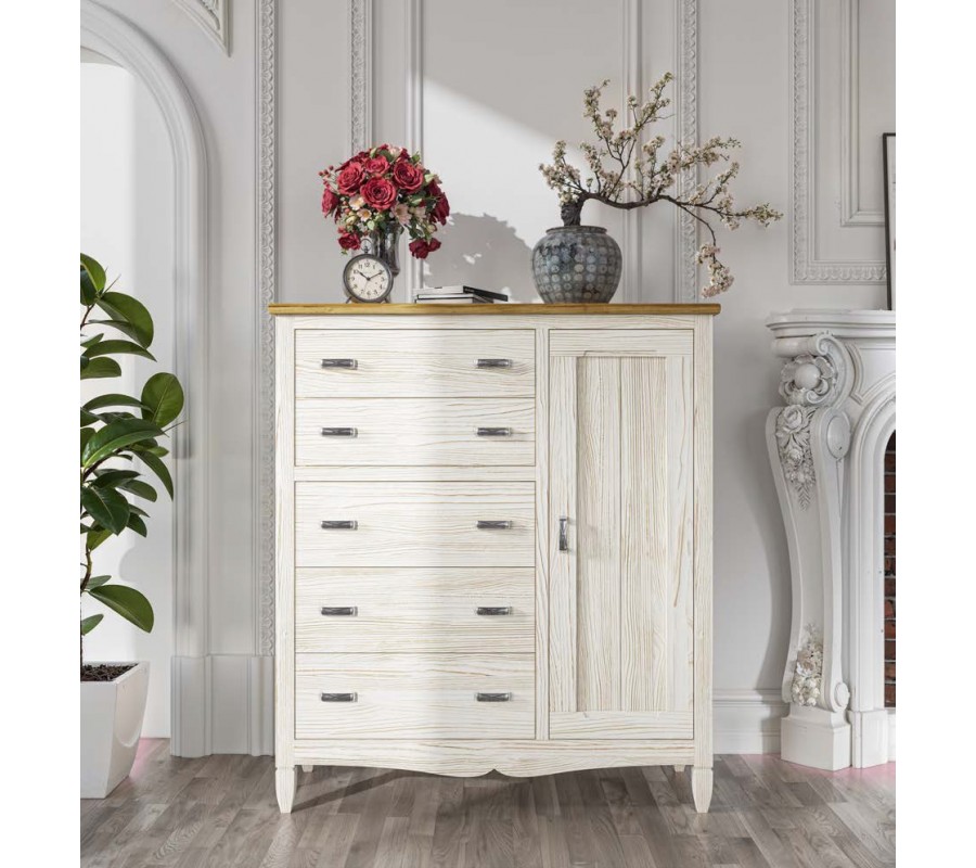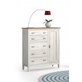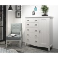 Klasická moderná vysoká masívna komoda Amberes z borovicového dreva so zásuvkami a jednodverovou skrinkou na nožičkách 123cm
