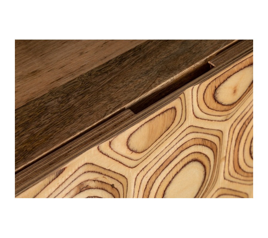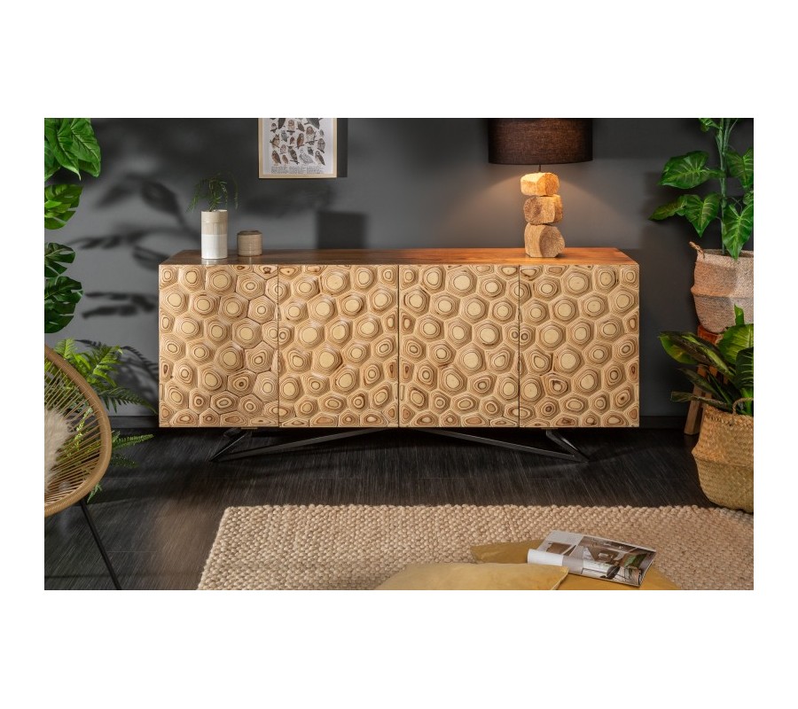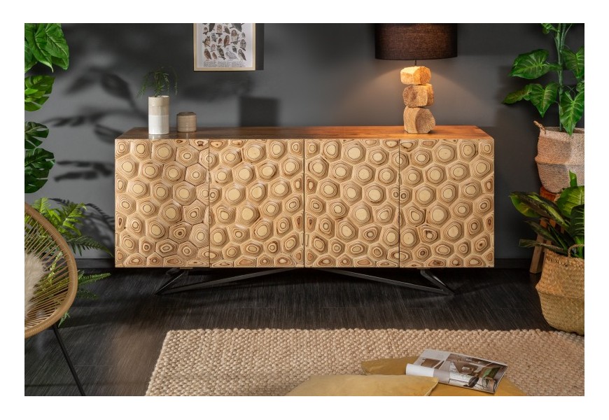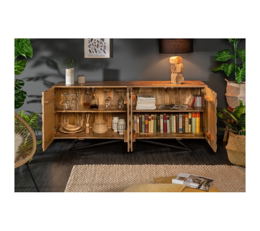 Moderná luxusná obdĺžniková komoda Arvid je vyrobená z prírodného dreveného masívu. Veľkým pútačom sú štyri dvierka, ktoré majú zaujímavú vypuklú štruktúru dreva, ktorá robí komodu jedinečnou. Vo vnútri sa ukrýva veľký ukladací priestor vhodný na knihy. Vhodne sa kombinuje so šedým pozadím a zeleňou. Tým pádom z neho vycítiť čaro, ktoré prináša do priestoru. Hodí sa do koloniálne zariadených interiérov. Obohatí Váš interiér.