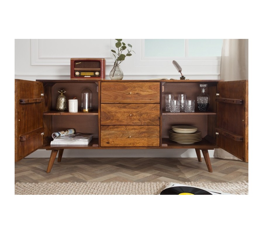 Luxusný masívny príborník Mozaika je vyrobený z prírodného dreveného masívu z agátového dreva. Disponuje dvomi ukladacími priestormi, ktoré majú dvierka s ornamentmi. Ich šikmý tvar je typický pre retro nábytok. Príborník je na povrchu hladký a má zachovanú štruktúru dreva palisander. Taktiež ho dopĺňajú tri zásuvky, ktoré ukrývajú ďalší odkladací priestor. Postavený je na štyroch pevných drevených nohách, ktoré sú odsadené vyššie od zeme a zaručujú ľahší prístup pri upratovaní. Keďže sa jedná o drevený masív, každý vyhotovený produkt je jedinečný. Poslúži aj ako komoda. Príborník má na dvierkach dominantný reliéf pripomínajúci mozaiku. Dokonalo sa hodí do moderne a prírodne zariadených interiérov. Môžeme ho doplniť o prvky v prírodných zemitých farbách a vystihnúť jeho eleganciu. Preto ak Vašou slabosťou sú prírodné prvky, neváhajte siahnuť po tomto príborníku, ktorý očarí Váš zrak.