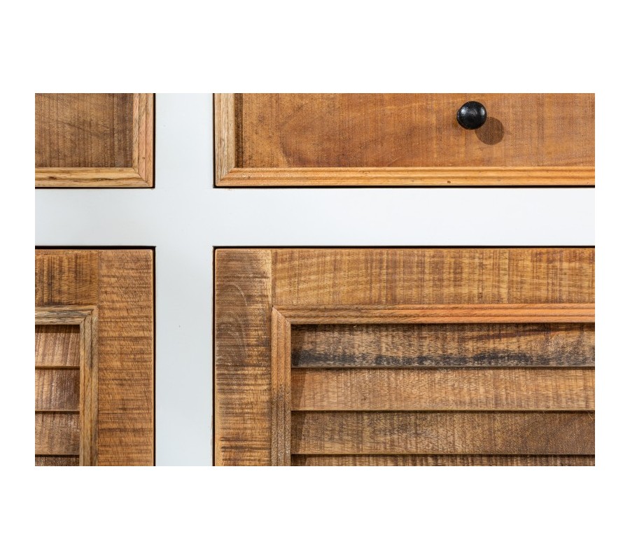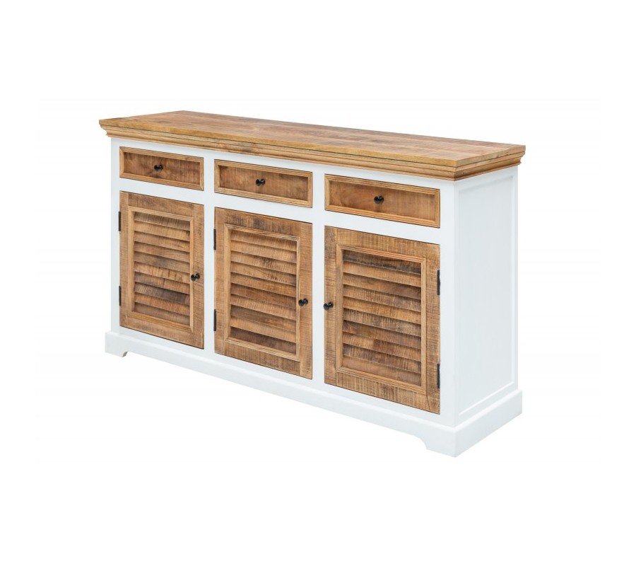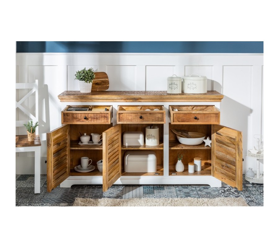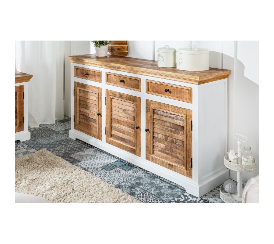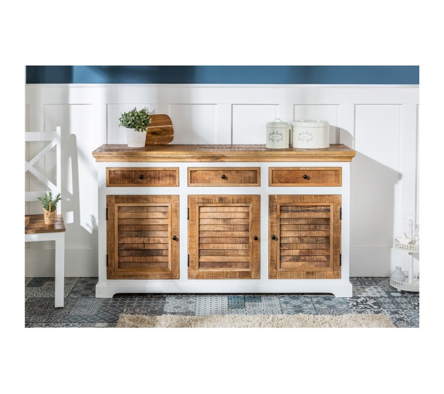 Luxusná a nadčasový príborník Frida Blanca je dokonalým predstaviteľom vidieckeho štýlu s nádychom vidieckeho a provensálskeho štýlu vďaka dômyselnej kombinácii hnedého masívneho dreva s bielymi časťami. Dizajnová skrinka Frida Blanca Vám poskytuje dostatok úložného priestoru prostredníctvom troch priestranných skriniek a troch zásuviek s vkusnými minimalistickými rúčkami. Vkusný dizajn skrinky dovoľuje nádhernému hnedému mangovému masívu vo svojej prirodzenej farbe naozaj zažiariť na bielom podklade. Príborník Frida Blanca dokážete využiť i komodu v spálni i obývačke, odporúčame kombinovať najmä s kúskami v zemitej farebnosti z prírodných materiálov.
