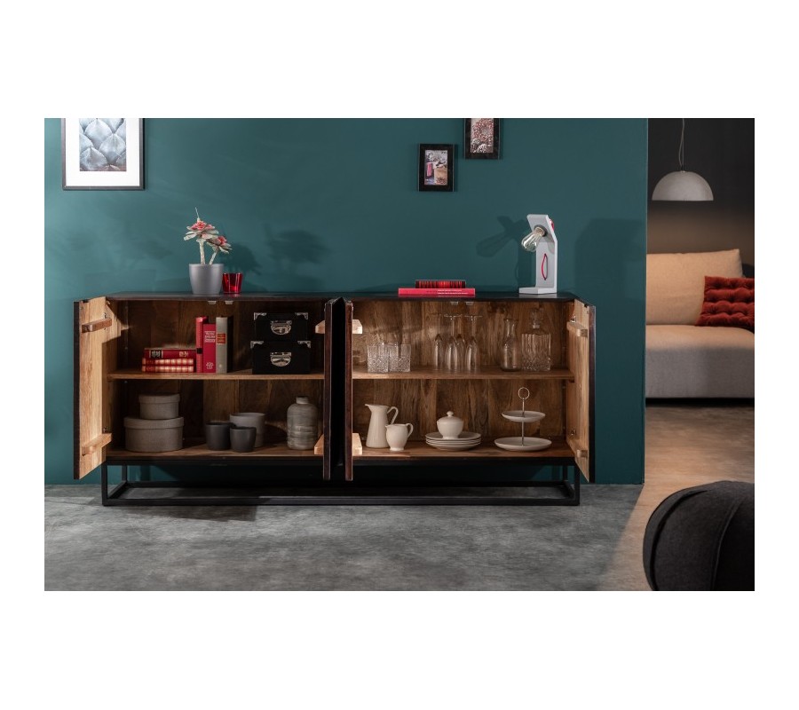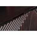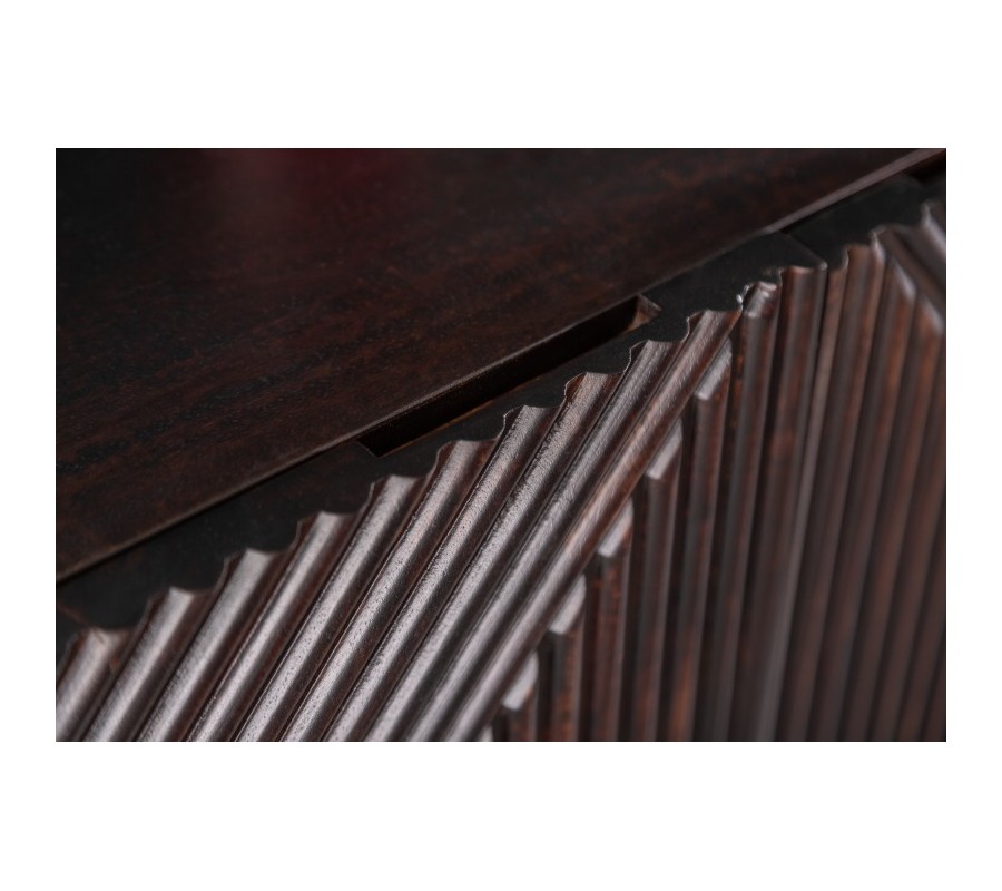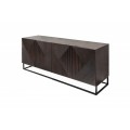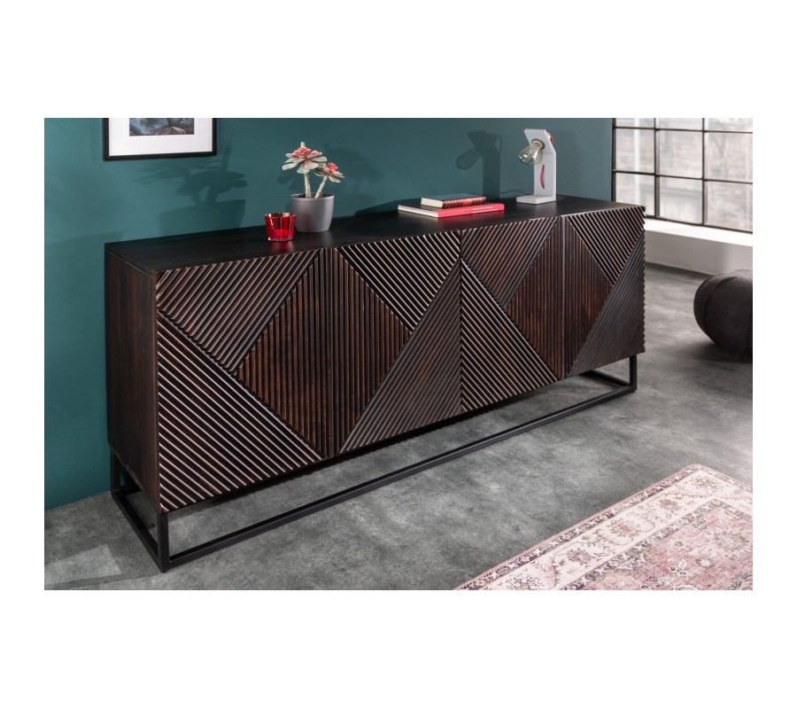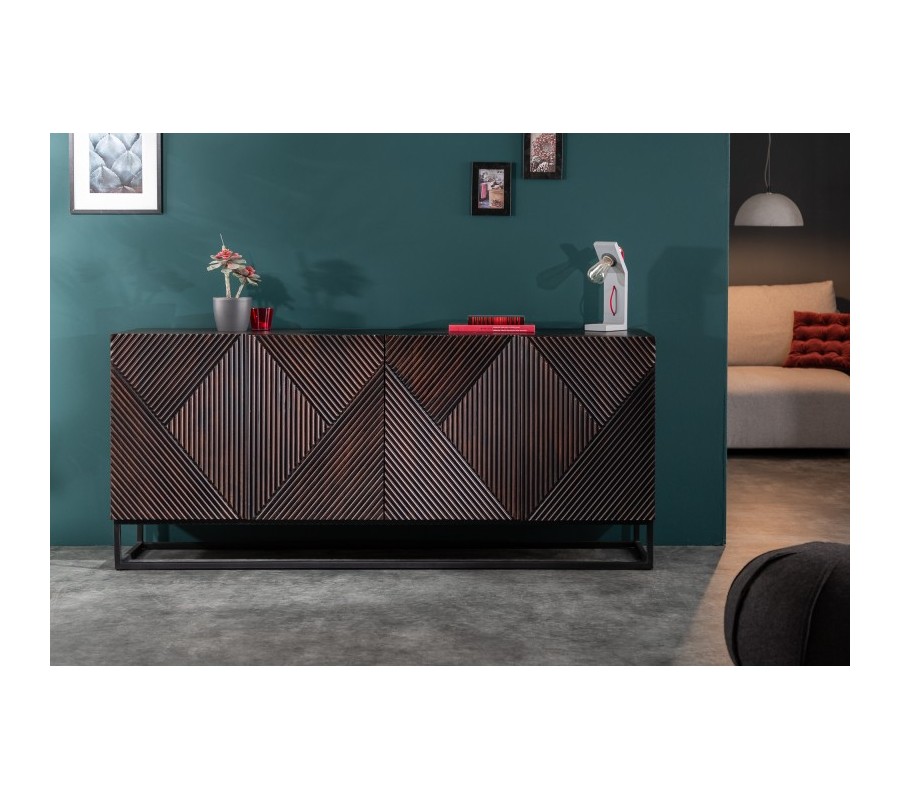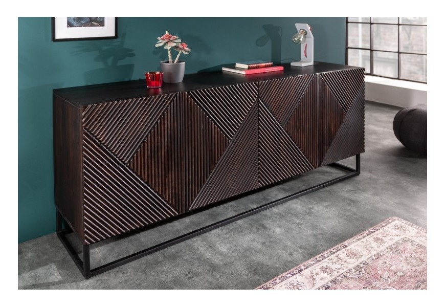 Jedinečný vzhľad dlhej komody Diamandi spočíva v bohato dekorovaných pohľadových častiach jej dvierok. Dvierka sú vyrobené z masívneho mangového dreva a spolu vytvárajú výrazný reliéfny geometrický vzor. Tmavý odtieň mangového dreva je doplnený decentnou kovovo konštrukciou v čiernej farbe, ktorá hrubý masívny vzhľad komody značne odľahčuje. Dizajnová komoda Diamandi sa stane dokonalým doplnením vašich luxusných moderných domácností, no zaručene zaujme aj ako vybavenie hotelových izieb či reprezentatívnych priestorov vašich firiem. Môžete ju kombinovať s tmavými masívnymi či kovovými industriálnymi prvkami, vďaka svojmu výraznému vzoru skvele doplní aj moderné interiéry s prvkami Art-deco štýlu.