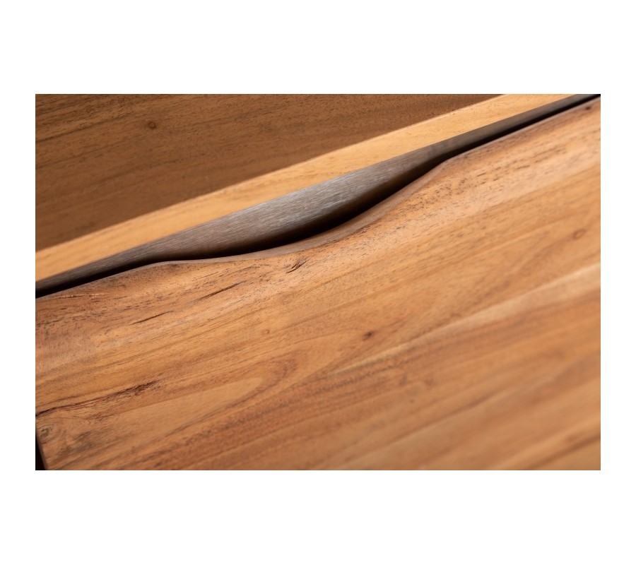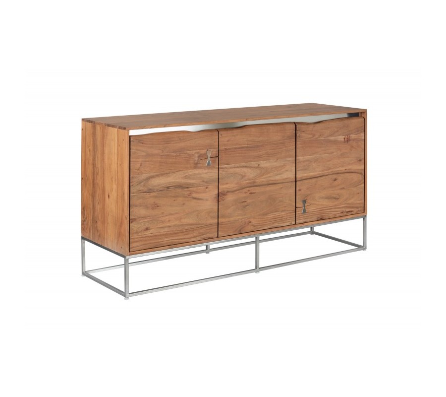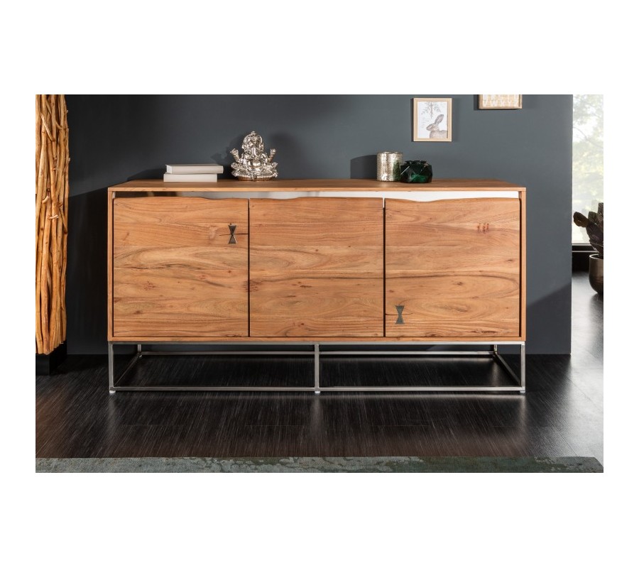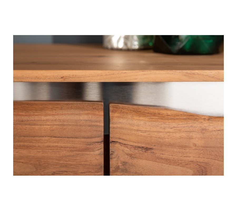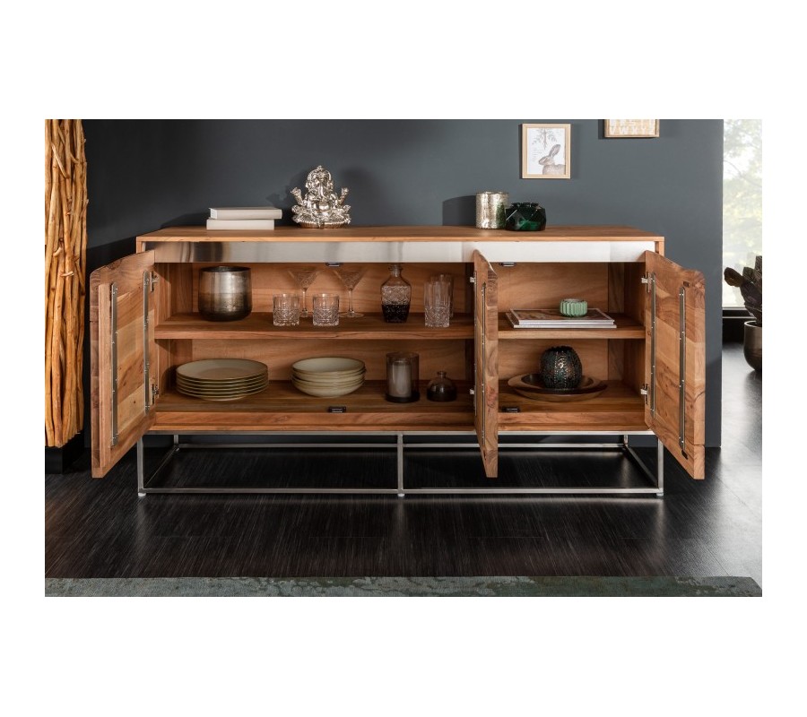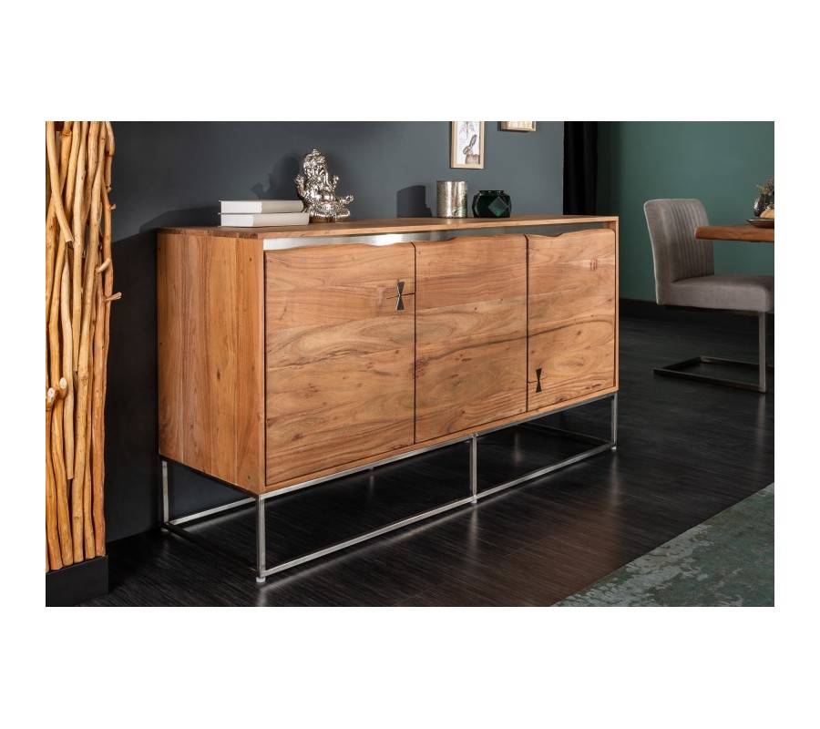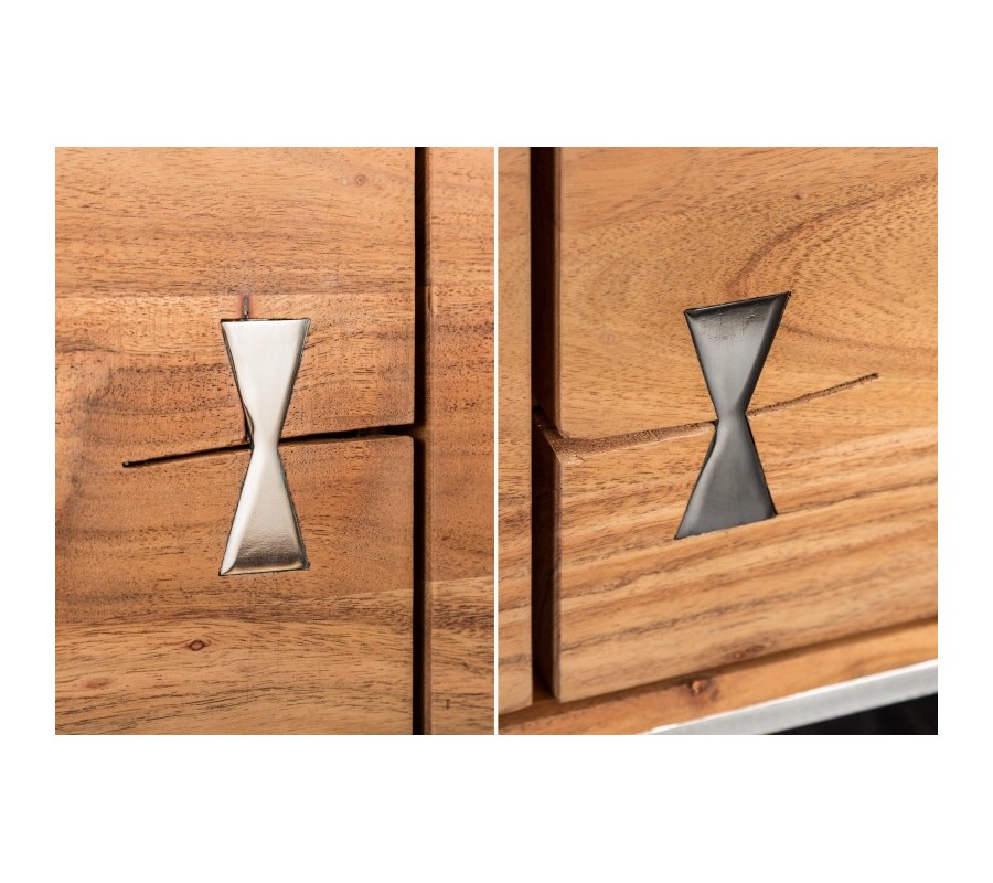 Masívna moderná komoda Mammut z dreva akácie s chrómovou konštrukciou a dekoratívnymi prvkami na dvierkach 147cm