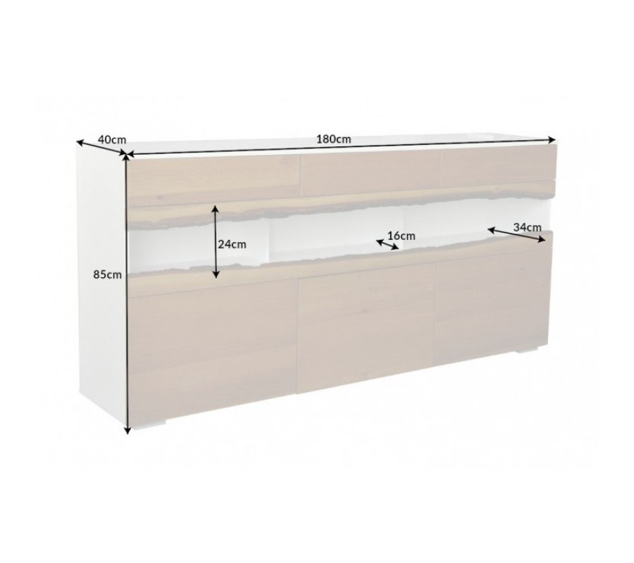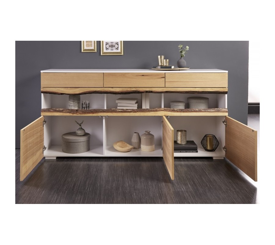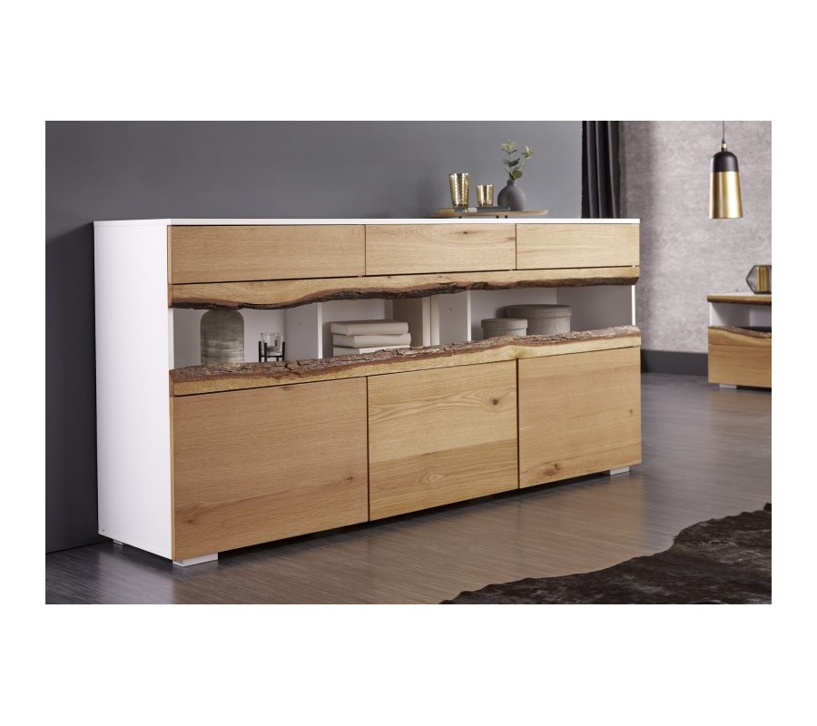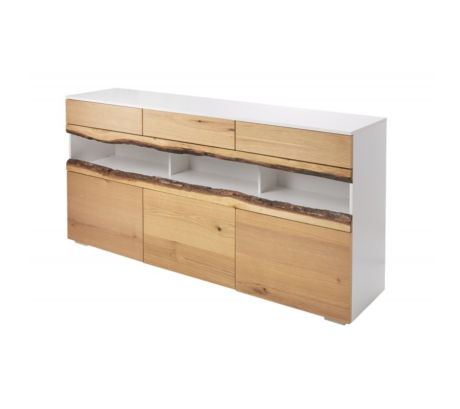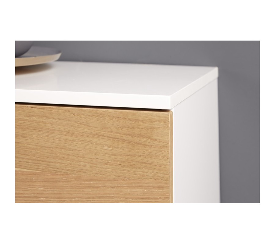 Tento moderný kúsok rafinovane kombinuje prirodzený vzhľad obľúbeného dubového dreva s moderným matným povrchom v bielej farbe, čím vytvára harmonický kontrast. Dubový masívny povrch je ošetrený olejom, ktorý podčiarkuje prirodzený vzhľad dreva. Komoda okrem trojice praktických zásuviek a poličiek, ktoré sú ukryté za masívnymi dvierkami disponuje otvorenou poličkou, vhodnou na vystavenie odkladaných predmetov. Komoda Lush Oak dokonale vynikne v kombinácii s nábytkom z rovnomennej kolekcie. Môžete ju kombinovať s masívnym nábytkom v modernom duchu, skvele vynikne obklopená mäkkými textíliami v podobe štýlových závesov, kobercov či čalúneného nábytku.
