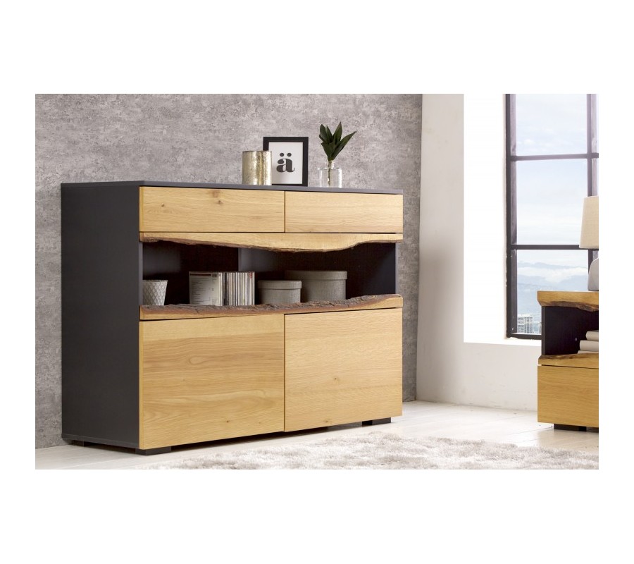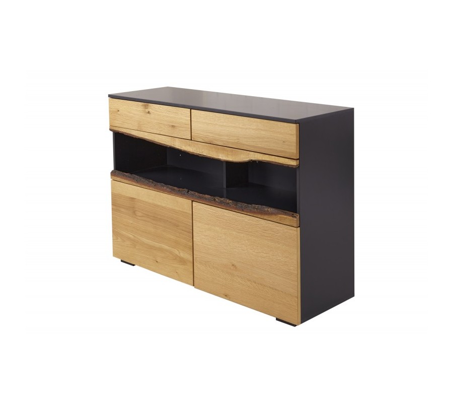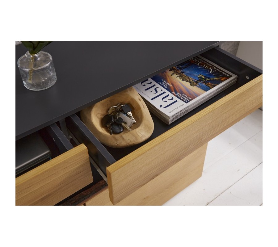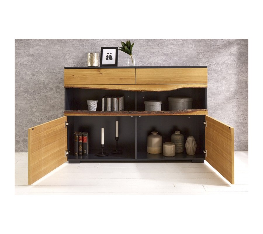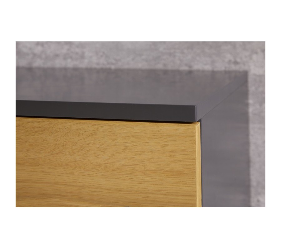 Štýlová komoda Lush Oak je výnimočná spojením dvoch nadčasových a pôsobivo kontrastných materiálov. Moderný matný povrch tmavo sivej konštrukcie, ktorá tvorí rám komody, dotvára neprehliadnuteľná kresba a štruktúra masívneho dubového dreva na pohľadových častiach zásuviek a dvierok. Dubový masívny povrch je ošetrený olejom, ktorý podčiarkuje prirodzený vzhľad dreva a s matným rámom v tmavo sivej farbe tak vytvára dokonalý kontrast. Komoda okrem dvojice praktických zásuviek a poličiek, ktoré sú ukryté za masívnymi dvierkami disponuje otvorenou poličkou, vhodnou na vystavenie odkladaných predmetov. Komoda Lush Oak dokonale vynikne v kombinácii s nábytkom z rovnomennej kolekcie.