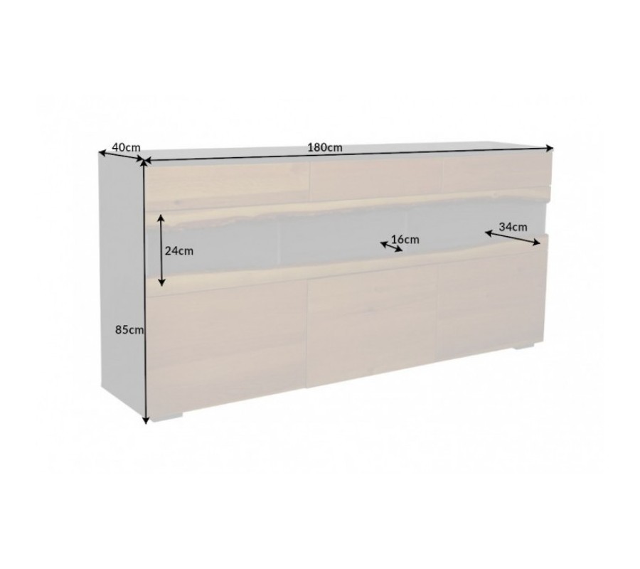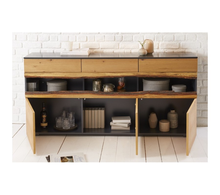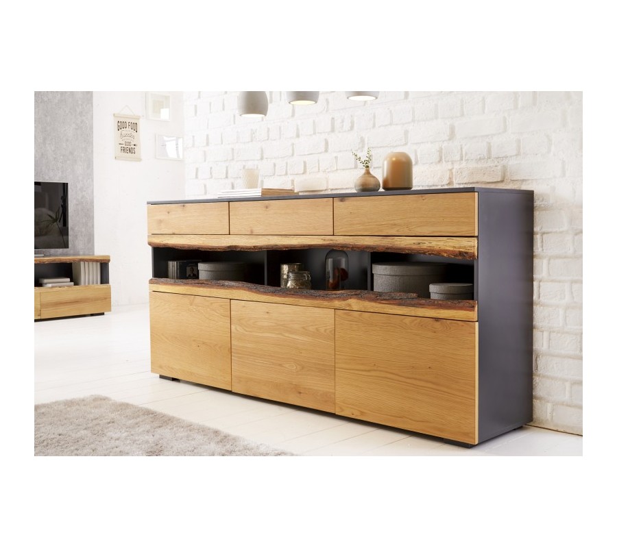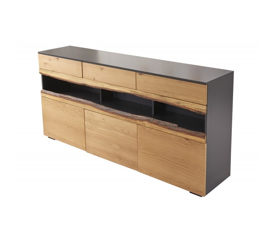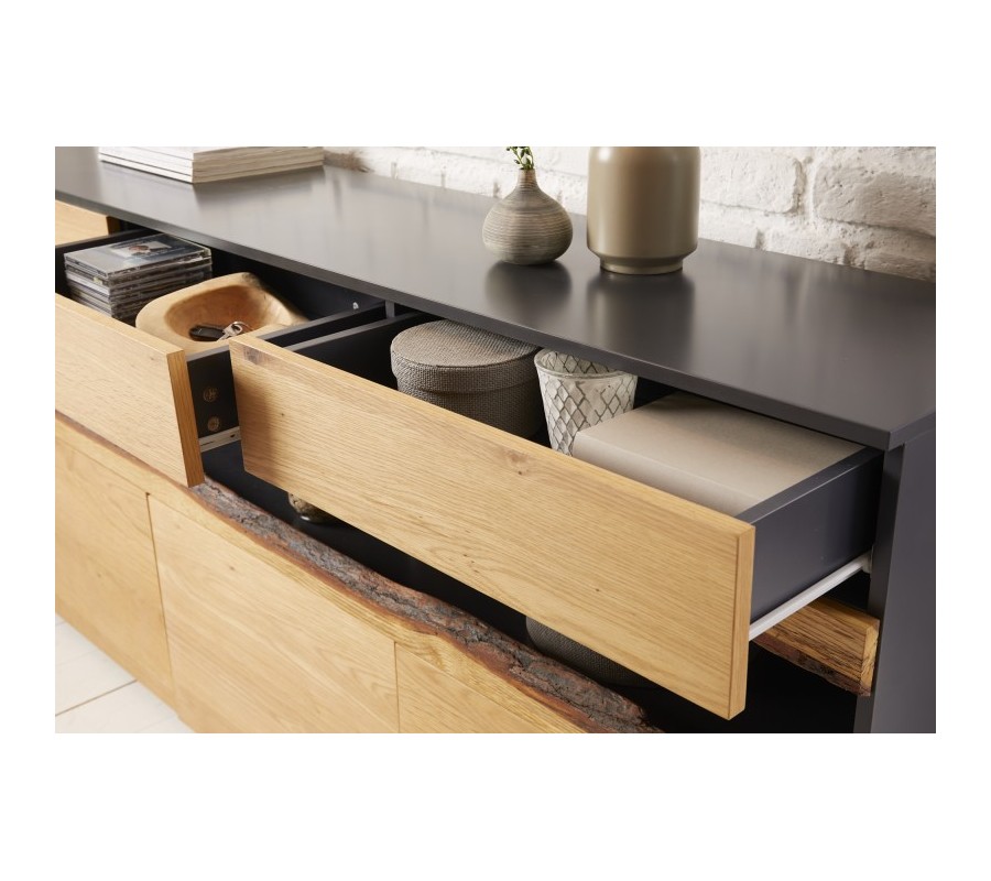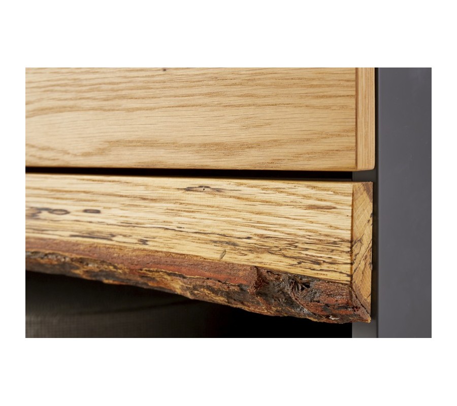 Štýlová komoda Lush Oak je výnimočná spojením dvoch nadčasových a pôsobivo kontrastných materiálov. Moderný matný povrch tmavo sivej konštrukcie, ktorá tvorí rám komody, dotvára neprehliadnuteľná kresba a štruktúra masívneho dubového dreva na pohľadových častiach zásuviek a dvierok. Dubový masívny povrch je ošetrený olejom, ktorý podčiarkuje prirodzený vzhľad dreva a s matným rámom v tmavo sivej farbe tak vytvára dokonalý kontrast. Komoda okrem trojice praktických zásuviek a poličiek, ktoré sú ukryté za masívnymi dvierkami disponuje otvorenou poličkou, vhodnou na vystavenie odkladaných predmetov. Komoda Lush Oak dokonale vynikne v kombinácii s nábytkom z rovnomennej kolekcie.