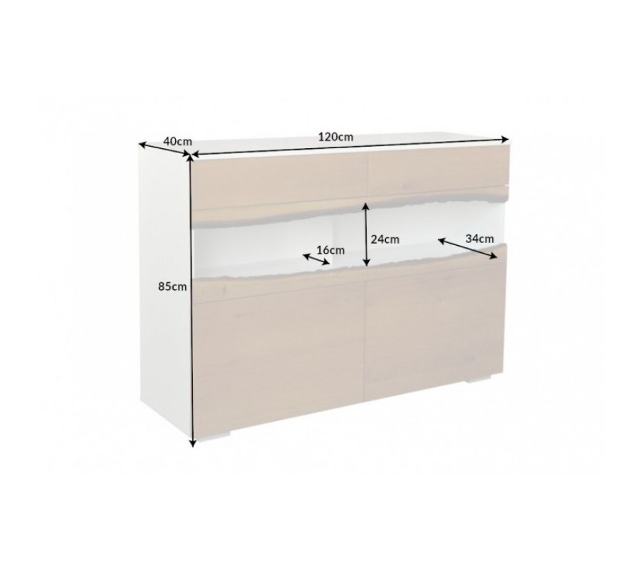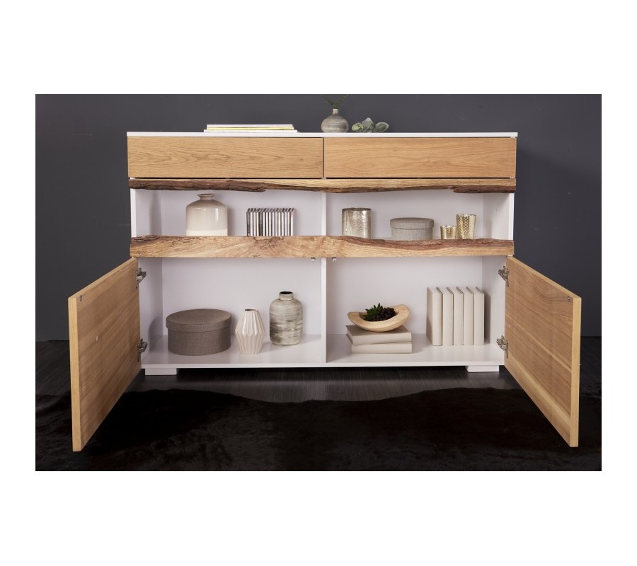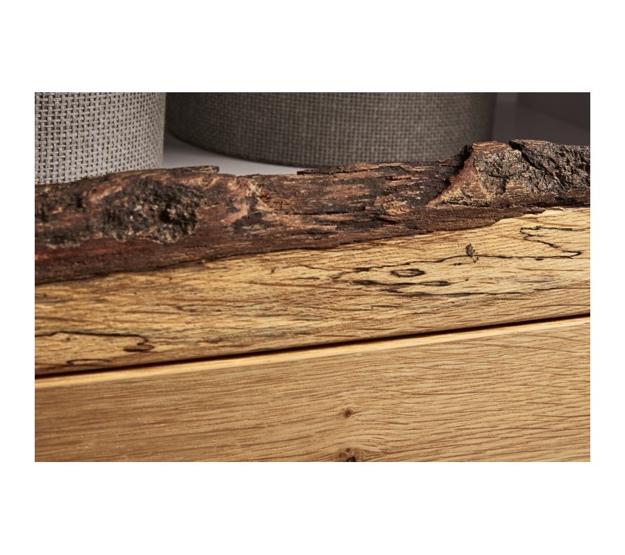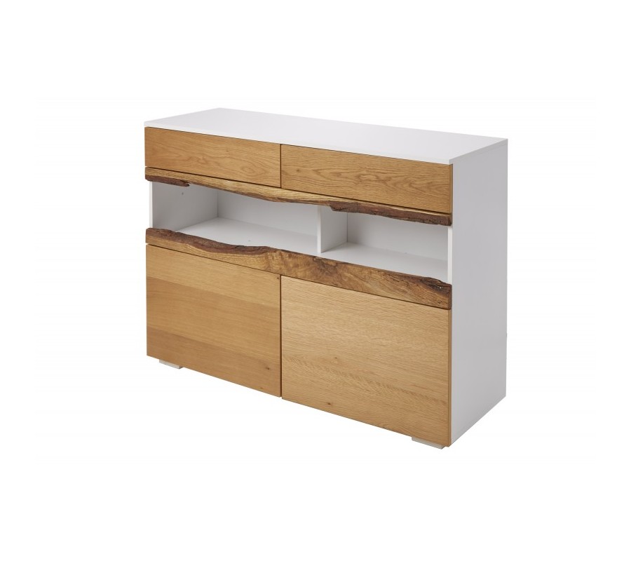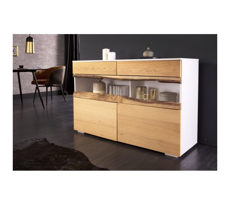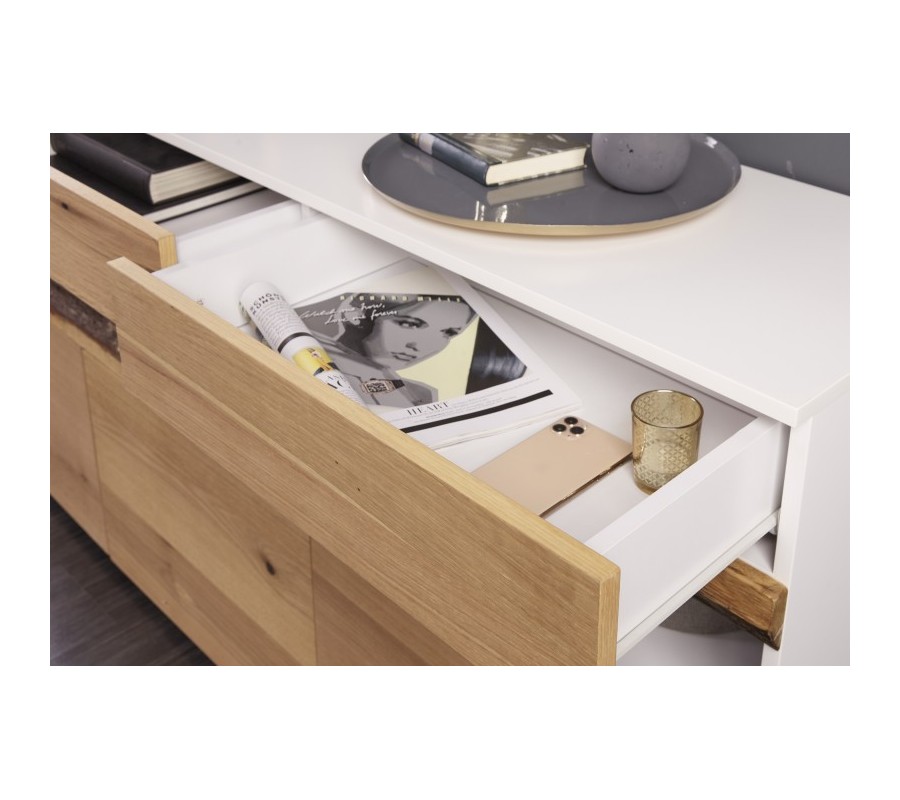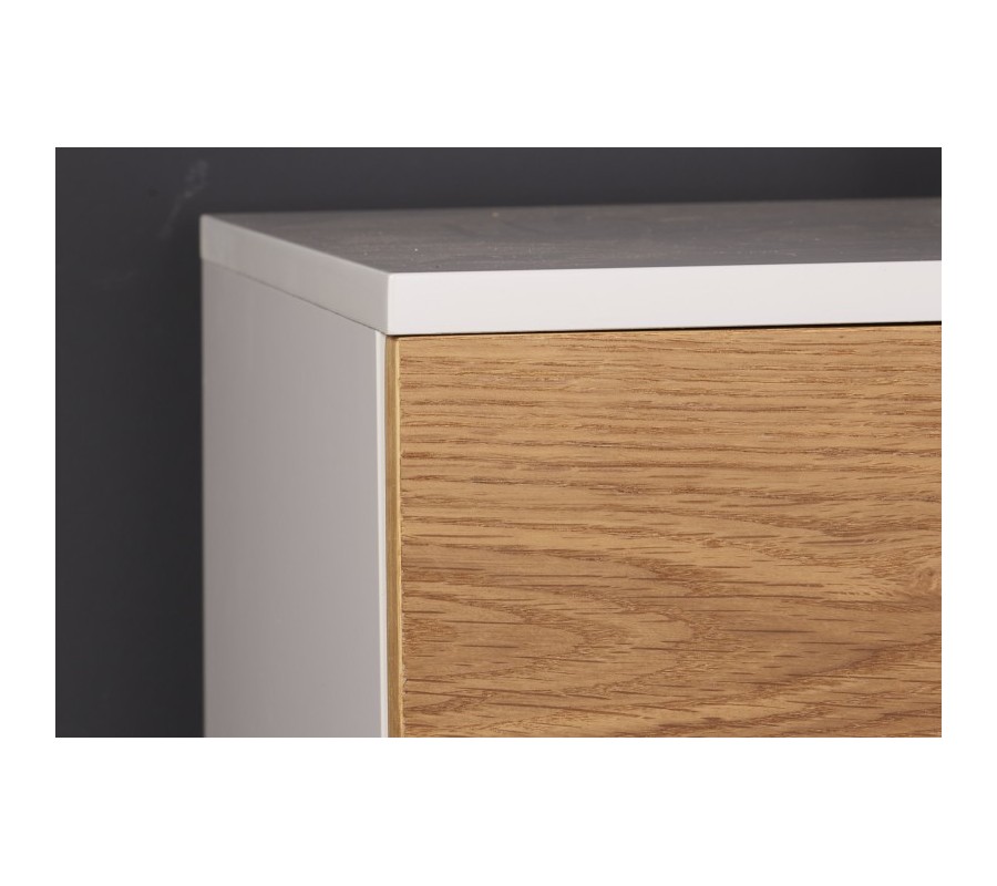 Štýlová komoda Lush Oak je výnimočná spojením dvoch nadčasových a pôsobivo kontrastných materiálov. Moderný matný povrch bielej konštrukcie, ktorá tvorí rám komody, dotvára neprehliadnuteľná kresba a štruktúra masívneho dubového dreva na pohľadových častiach zásuviek a dvierok. Dubový masívny povrch je ošetrený olejom, ktorý podčiarkuje prirodzený vzhľad dreva a s matným rámom v bielej farbe tak vytvára dokonalý kontrast. Komoda okrem dvojice praktických zásuviek a poličiek, ktoré sú ukryté za masívnymi dvierkami disponuje otvorenou poličkou, vhodnou na vystavenie odkladaných predmetov. Komoda Lush Oak dokonale vynikne v kombinácii s nábytkom z rovnomennej kolekcie.