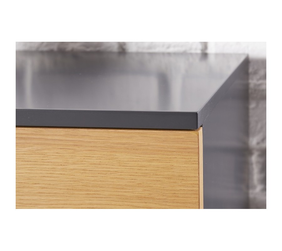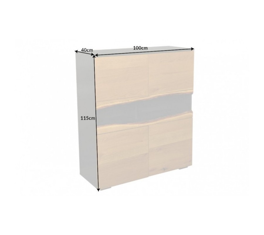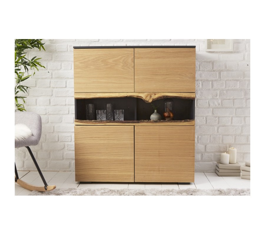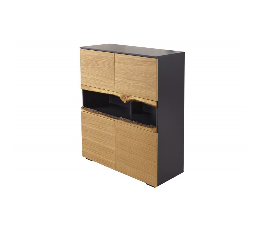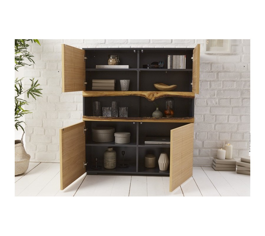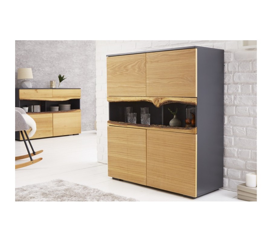 Štýlová vysoká komoda Lush Oak je výnimočná spojením dvoch nadčasových a pôsobivo kontrastných materiálov. Moderný matný povrch tmavo sivej konštrukcie, ktorá tvorí rám komody, dotvára neprehliadnuteľná kresba a štruktúra masívneho dubového dreva na pohľadových dvierok. Dubový masívny povrch je ošetrený olejom, ktorý podčiarkuje prirodzený vzhľad dreva a s matným rámom v tmavo sivej farbe tak vytvára dokonalý kontrast. Komoda okrem praktických poličiek, ktoré sú ukryté za štvoricou masívnych dvierok disponuje otvorenou poličkou, vhodnou na vystavenie odkladaných predmetov. Komoda Lush Oak dokonale vynikne v kombinácii s nábytkom z rovnomennej kolekcie.