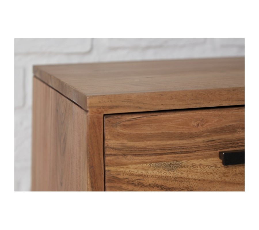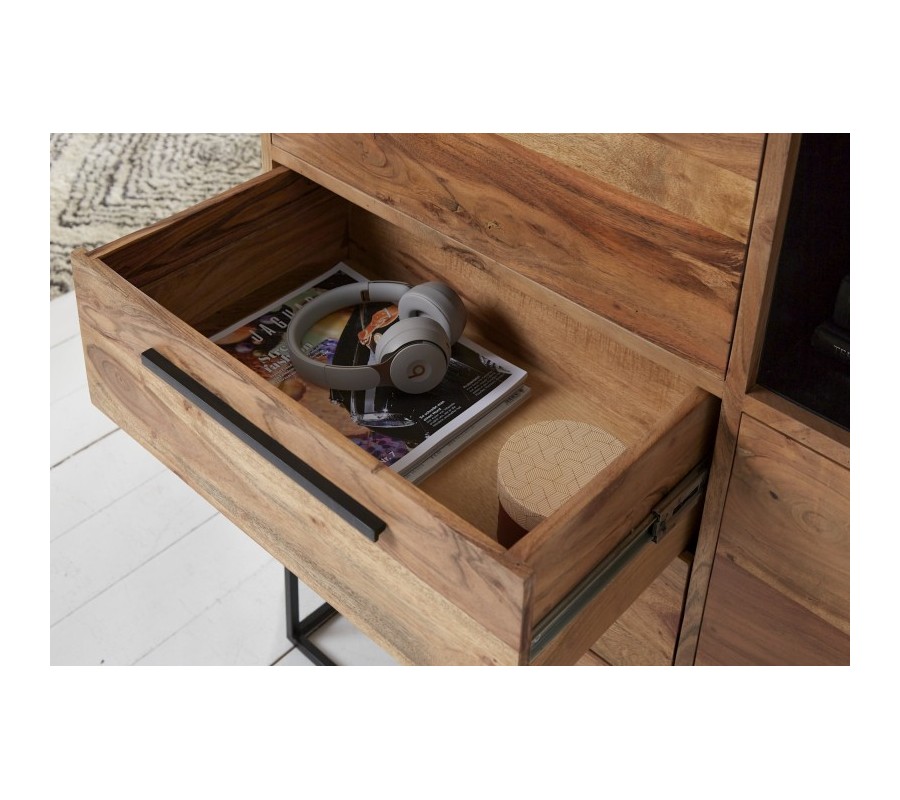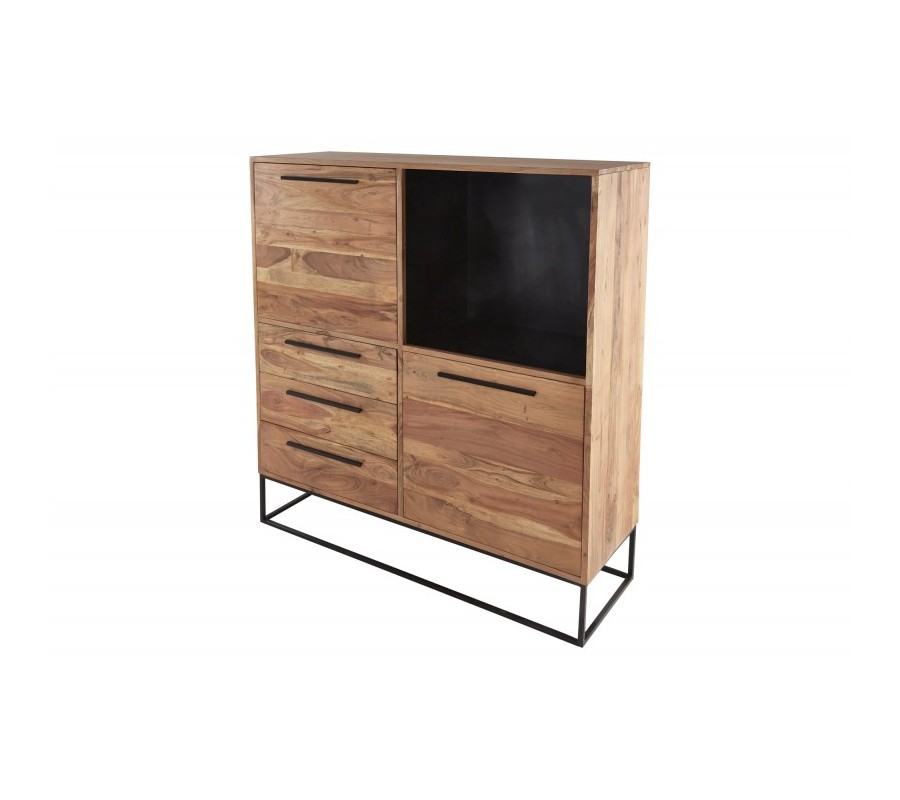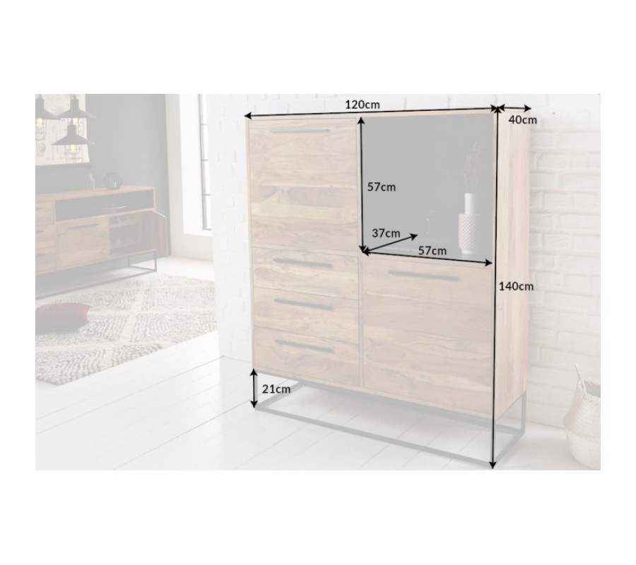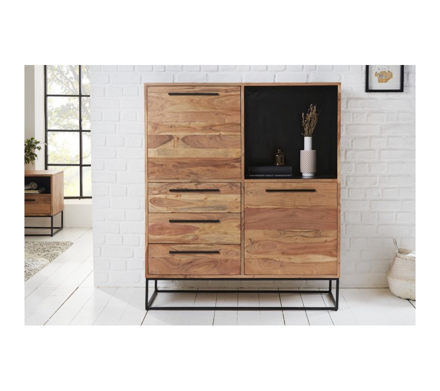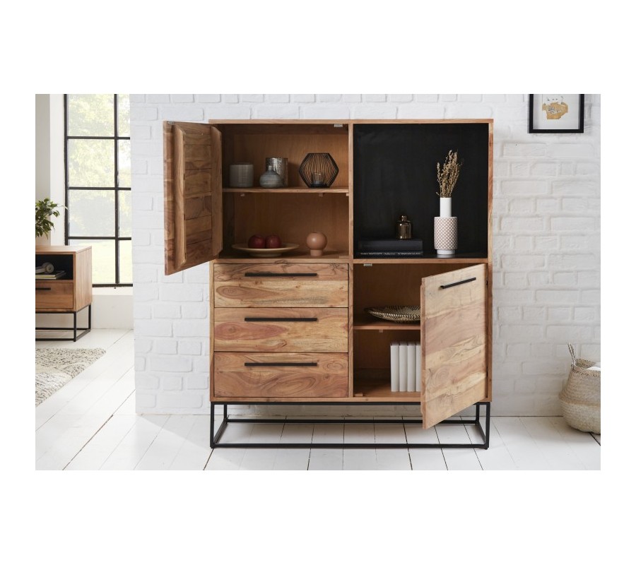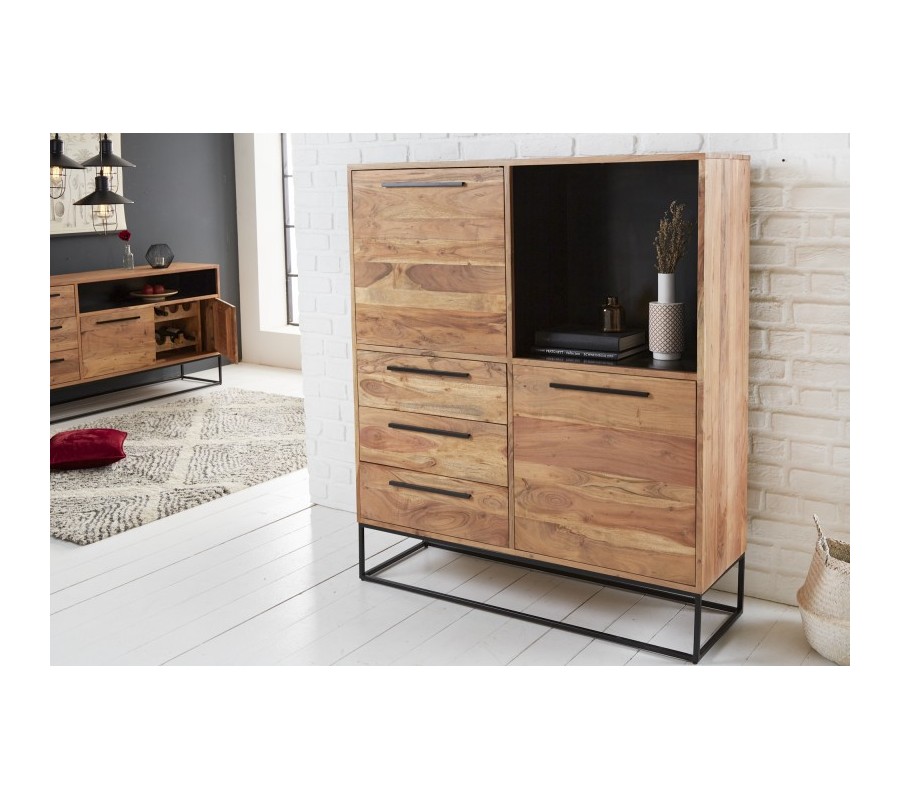 Štýlová vysoká komoda Linear disponuje mimoriadnym úložným priestorom, ktorý pozostáva z otvorenej poličky, zásuviek aj priestorom s poličkami ukrytými za masívnymi dvierkami. Tvar komody a kompozičné usporiadanie jednotlivých úložných segmentov dodržiava prísnu geometriu, ktorá sa opakuje v minimalistickom prevedení čiernej konštrukcie. Komoda je vyrobená z masívneho dreva akácie, ktoré je ručne spracované a zámerne použité v nerovnomernom naturálnom vzhľade. Nadčasový a čistý dizajn komody sa stane skvelým doplnením interiérov v rozličných štýloch. Skvele doplní moderný priestor plný kovových či masívnych prvkov, no zapadne aj do surového industriálneho priestoru. Vysokú komodu Linear odporúčame kombinovať s prvkami z rovnomennej kolekcie Linear.