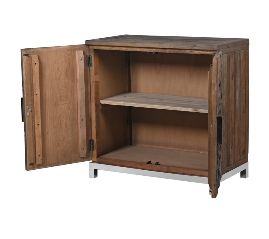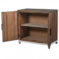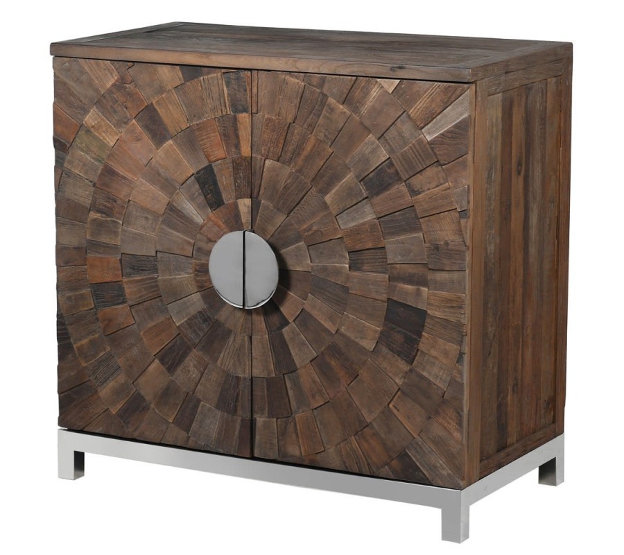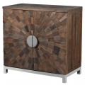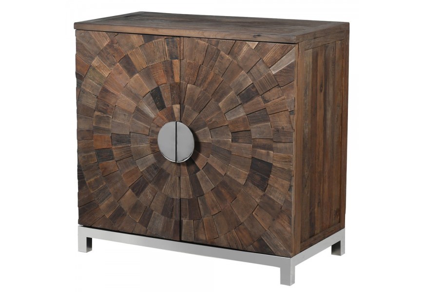 Dizajnová skrinka Furria príjemne doplní priestory každej modernej domácnosti. Získa si vás svojím špecifickým originálnym dizajnom, ktorý z nej robí unikátny kúsok s nádychom luxusného štýlu. Skrinka je vyrobená z recyklovaného brestového dreva v prírodnej hnedej farbe s nádhernou naturálnou kresbou. Drsný povrch je dosiahnutý zámerným ponechaním štruktúry brestového dreva. Dvojica dvierok je z prednej časti zdobená zaujímavým štruktúrovaným vzorom tvoreným ukladaním malých častí drevených dosiek do kruhového tvaru. Vzniknutý ornament vďaka jemným farebným a štruktúrovým odchýlkam dodáva skrinke jedinečný prírodný efekt s nádychom moderného dizajnu. Dvierka zároveň ukrývajú úložný priestor v podobe dvoch priestranných poličiek. K masívnemu telu tvoria kontrast kovové úchyty a jednoduché elegantné nožičky v matnej striebornej farbe. Kombinácia tmavohnedej so striebornou dodáva luxusný nádych. Štýlová skrinka Furria vhodne doplní priestory luxusných obývačiek či pracovní zariadených masívnym nábytkom.