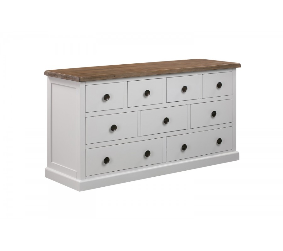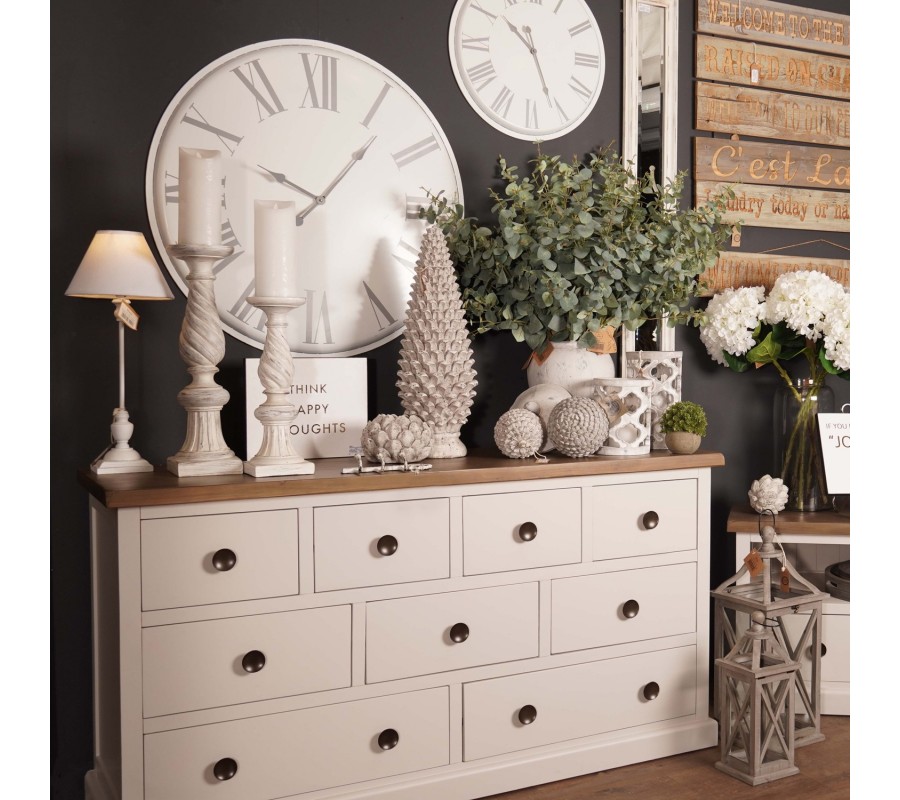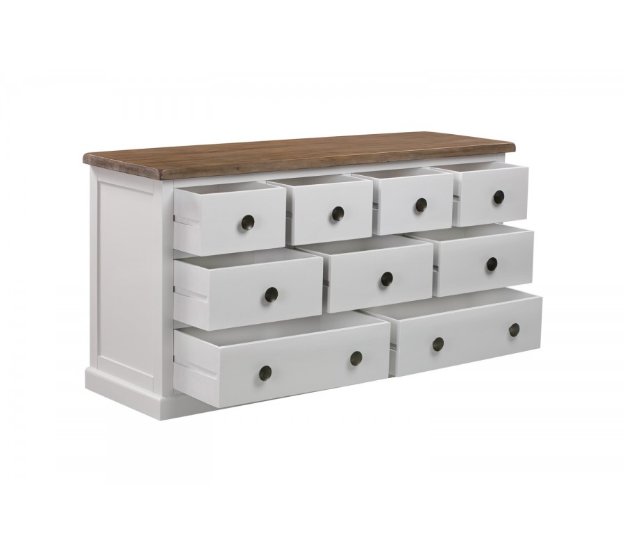 Luxusná komoda Escapia je jedinečným a univerzálnym kúskom, ktorý je vhodný na umiestnenie do provensálskych i klasicky ladených interiérov. Komoda sa nesie v nadčasovom jemnom off-white sivobielom odtieni, vďaka ktorému je vhodným kúskom na kombináciu s výraznými kontrastnými farbami i neutrálnejšími, jemnými kúskami. Vrchná doska prírodnej hnedej farby tvorí zaujímavú kombináciu a zvýrazňuje prirodzenú štruktúru masívneho dreva. Komoda disponuje deviatimi praktickými zásuvkami, ktoré umožňujú skvelú organizáciu všetkých vašich odevov či dokumentov. Kombináciou s ďalšími kúskami z našej kolekcie Escapia dosiahnete jedinečný provensálsky nádych, ktorý premení váš domov na romantickú vilu z francúzskeho vidieku.