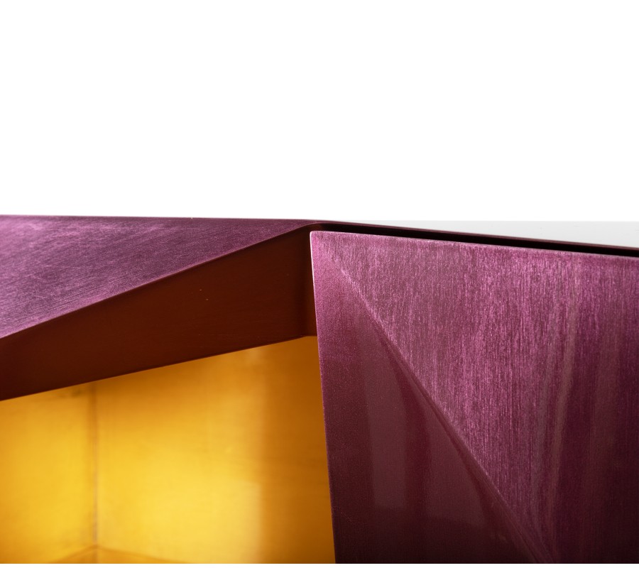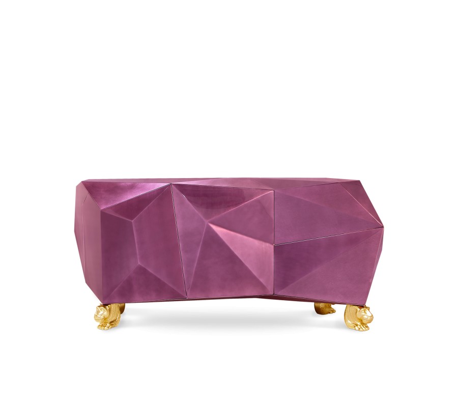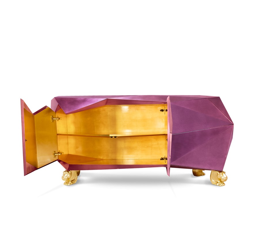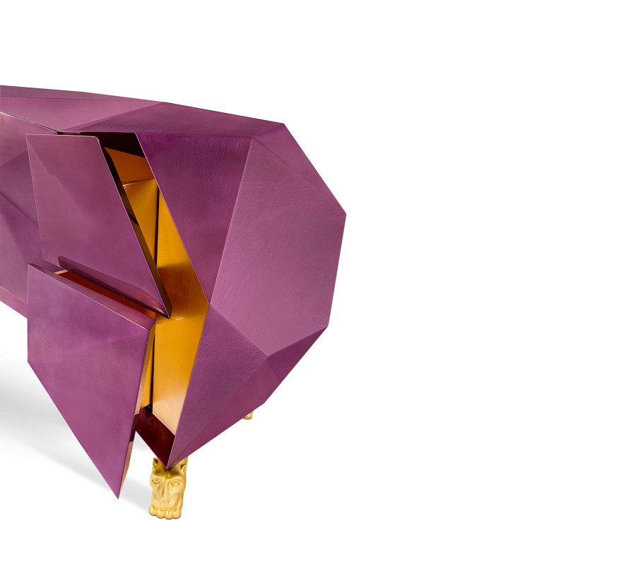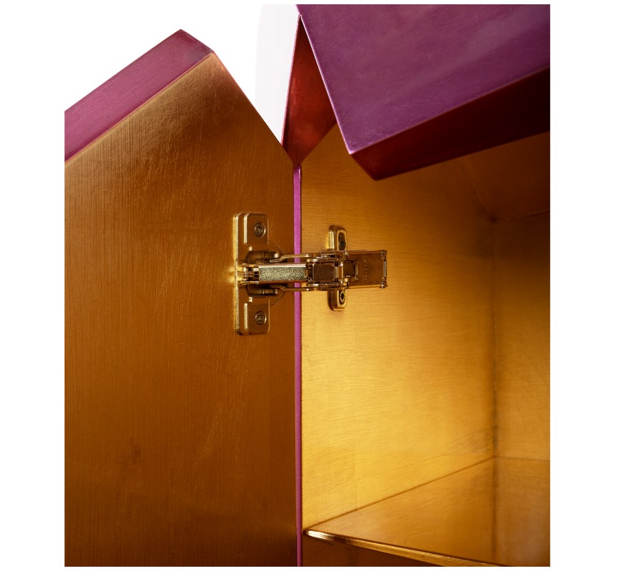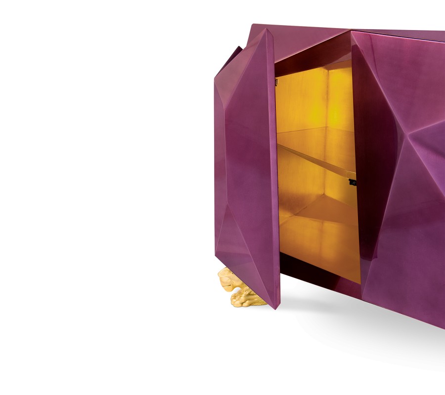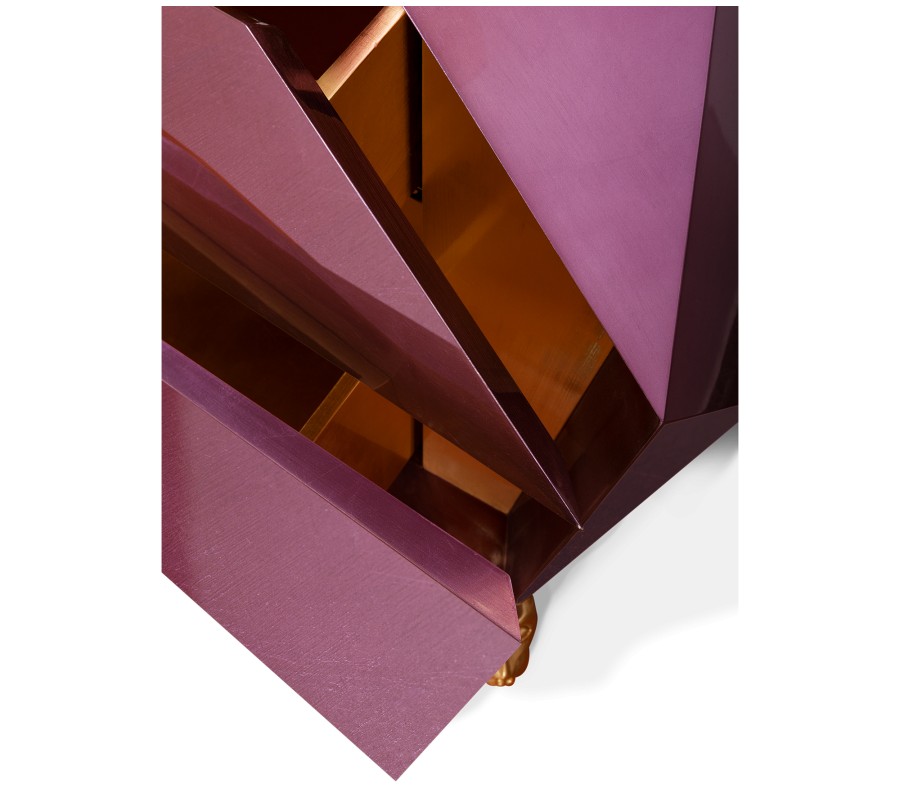 Luxusná komoda z masívneho dreva Diamond vo farbe Amethyst so zlatým zdobením predstavuje neokázalé spojenie dekonštruktivizmu a romantizmu. Pre asymetrické vyhotovenie bočných strán pripomínajúcich diamant v spojení s mäkkou ametystovou farbou sa moderná komoda v štýle art-deco stane naozajstným klenotom každého interiéru. Zmyselá ostrosť je zjemnená ako farbou tak i výnimočnou povrchovou úpravou. Telo komody je pokryté plátkovým zlatom, výrazným priesvitným odtieňom ametystu a lakom vo vysokom lesku. Masívnejšie ručne vyrezávané nožičky exkluzívnej komody sú zdobené plátkovým zlatom upevňujúcim dojem skutočného umeleckého diela. Plátkové zlato bolo použité aj pri vnútornom úložnom priestore. Pre spojenie zlata s leskom a nezvyčajným lomením odporúčame komodu umiestniť do svetlých miestností, aby sa mohlo svetlo od lesklého povrchu elegante odrážať. Luxusná komoda vynikne najmä v kombinácii so svetlejším moderným či art-deco nábytkom.