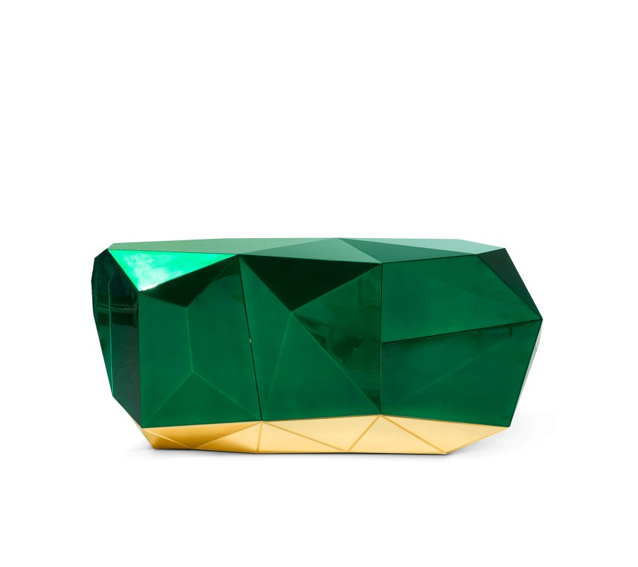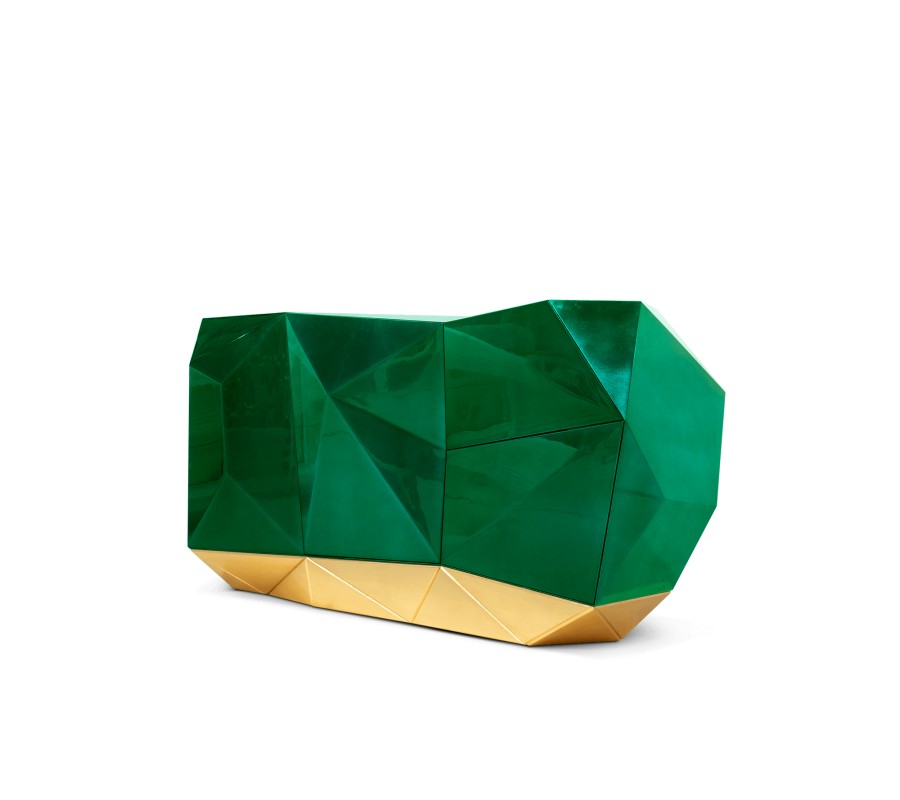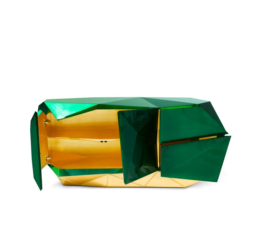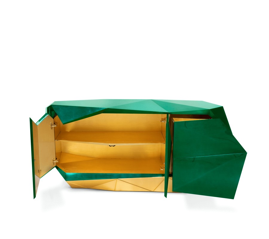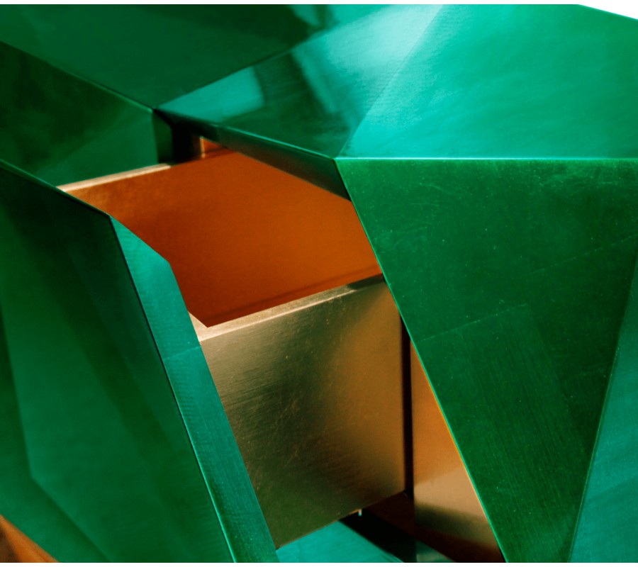 Luxusná komoda z masívneho dreva Diamond vo farbe Emerald so zlatým zdobením predstavuje neokázalé spojenie dekonštruktivizmu a romantizmu. Pre asymetrické vyhotovenie bočných strán pripomínajúcich diamant v spojení s podmanivou smaragdovou farbou sa moderná komoda v štýle art-deco stane naozajstným klenotom každého interiéru. Zmyselá ostrosť je zjemnená ako farbou, tak i výnimočnou povrchovou úpravou. Telo komody je pokryté plátkovým striebrom, podmanivým priesvitným odtieňom smaragdu a lakom vo vysokom lesku. Masívna podstava exkluzívnej komody sú rovanko zdobené plátkovým zlatom upevňujúcim dojem umeleckého diela. Zlaté listy boli použité aj pri vnútornom zdobení úložného priestoru - skrytej police a dvoch priestranných zásuviek. Luxusná komoda vynikne vo všetkých interiéroch najmä v kombinácii s ďalším moderným či art-deco nábytkom..
