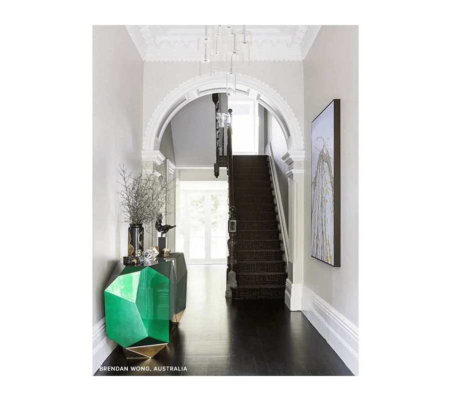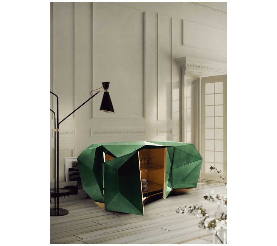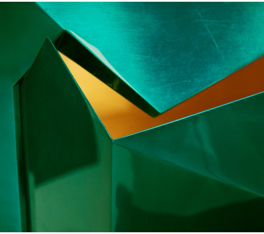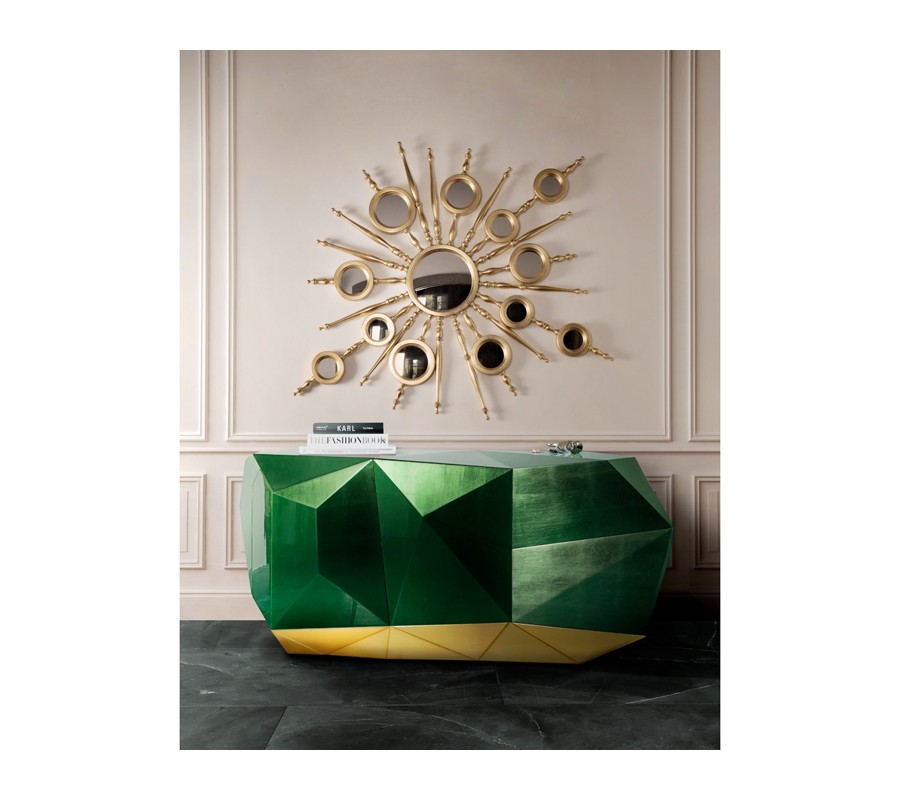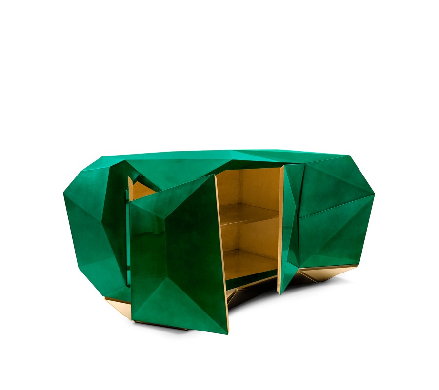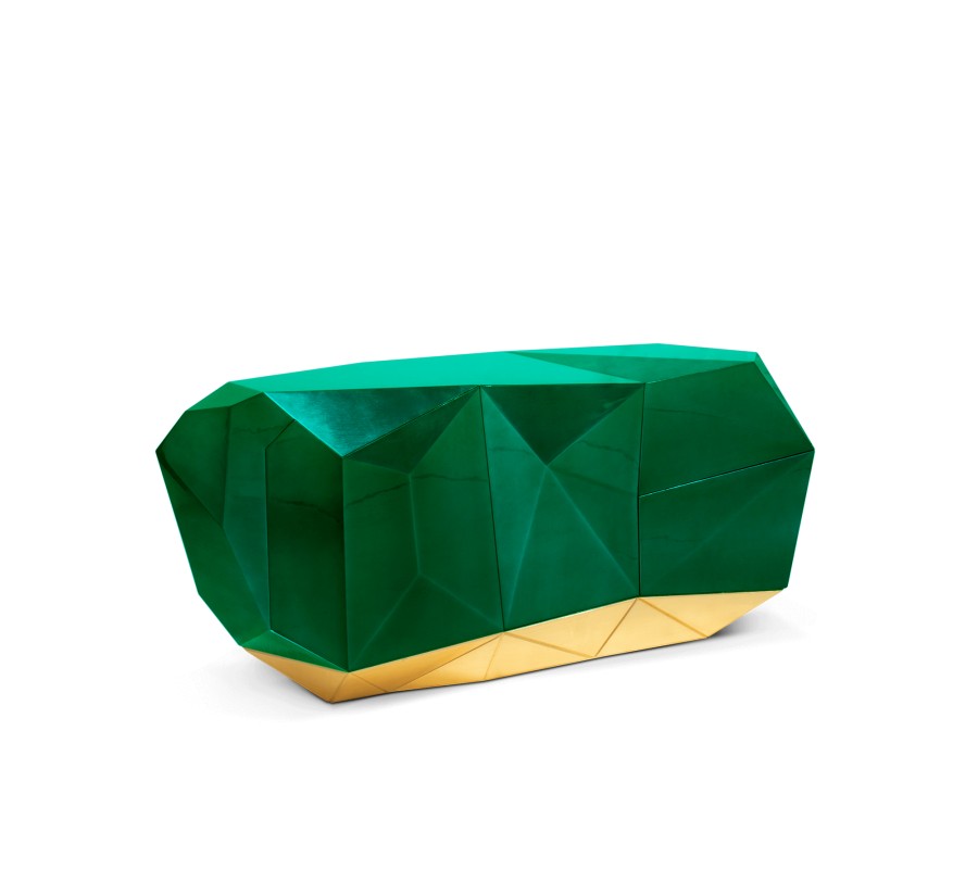 Luxusná komoda z masívneho dreva Diamond vo farbe Emerald so zlatým zdobením predstavuje neokázalé spojenie dekonštruktivizmu a romantizmu. Pre asymetrické vyhotovenie bočných strán pripomínajúcich diamant v spojení s podmanivou smaragdovou farbou sa moderná komoda v štýle art-deco stane naozajstným klenotom každého interiéru. Zmyselá ostrosť je zjemnená ako farbou, tak i výnimočnou povrchovou úpravou. Telo komody je pokryté plátkovým striebrom, podmanivým priesvitným odtieňom smaragdu a lakom vo vysokom lesku. Masívna podstava exkluzívnej komody sú rovanko zdobené plátkovým zlatom upevňujúcim dojem umeleckého diela. Zlaté listy boli použité aj pri vnútornom zdobení úložného priestoru - skrytej police a dvoch priestranných zásuviek. Luxusná komoda vynikne vo všetkých interiéroch najmä v kombinácii s ďalším moderným či art-deco nábytkom..