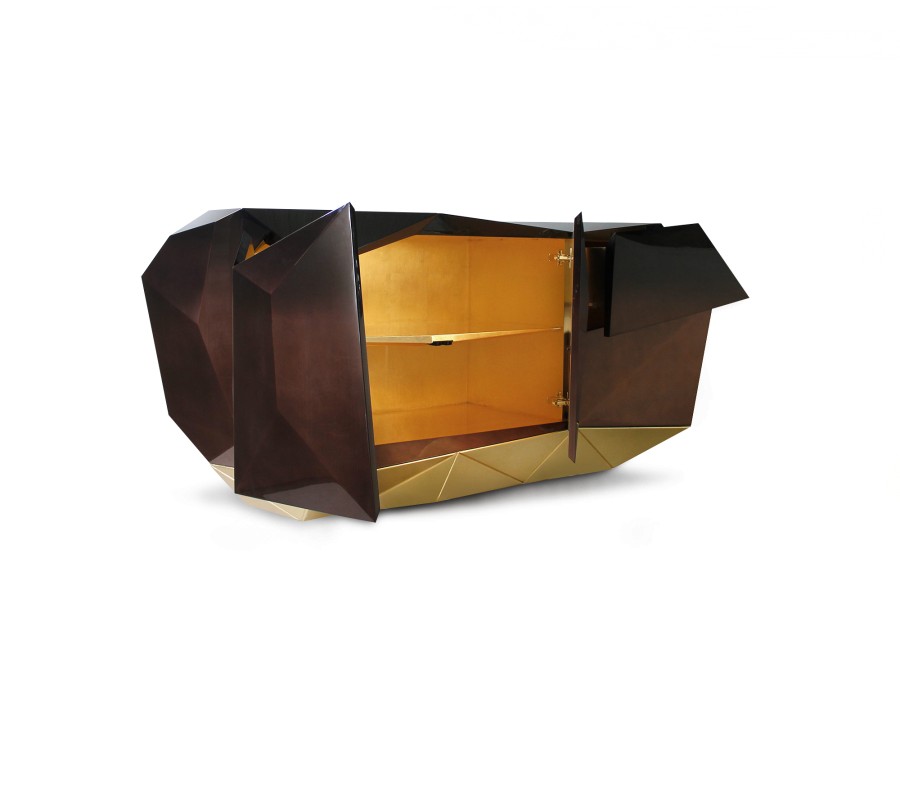Luxusný príborník z masívneho dreva Diamond vo farbe Chocolate so zlatým zdobením predstavuje neokázalé spojenie dekonštruktivizmu a romantizmu - zmyselá ostrosť je zjemnená ako farbou, tak i výnimočnou povrchovou úpravou. Asymetrické telo moderného príborníka je pokryté plátkovým striebrom s výrazným priesvitným čokoládovým odtieňom a vysokolesklým lakom, čo komode v štýle art-deco dodáva hrejivý lesk. Masívna podstava exkluzívneho príborníka, precízne zdobená plátkovým zlatom, upevňuje dojem umeleckého diela. Zlaté listy boli použité aj pri vnútornom zdobení dvojkrídlových dvierok skrývajúcich hlbokú policu a dvoch priestranných zásuviek. Toto spojenie teplých čokoládových farieb výborne doplnia koberce či dekorácie v zlatistých tónoch. Luxusný príborník vynikne ako na svetlom tak i tmavom pozadí, najmä v kombinácii s ďalším moderným či art-deco nábytkom našej ponuky.