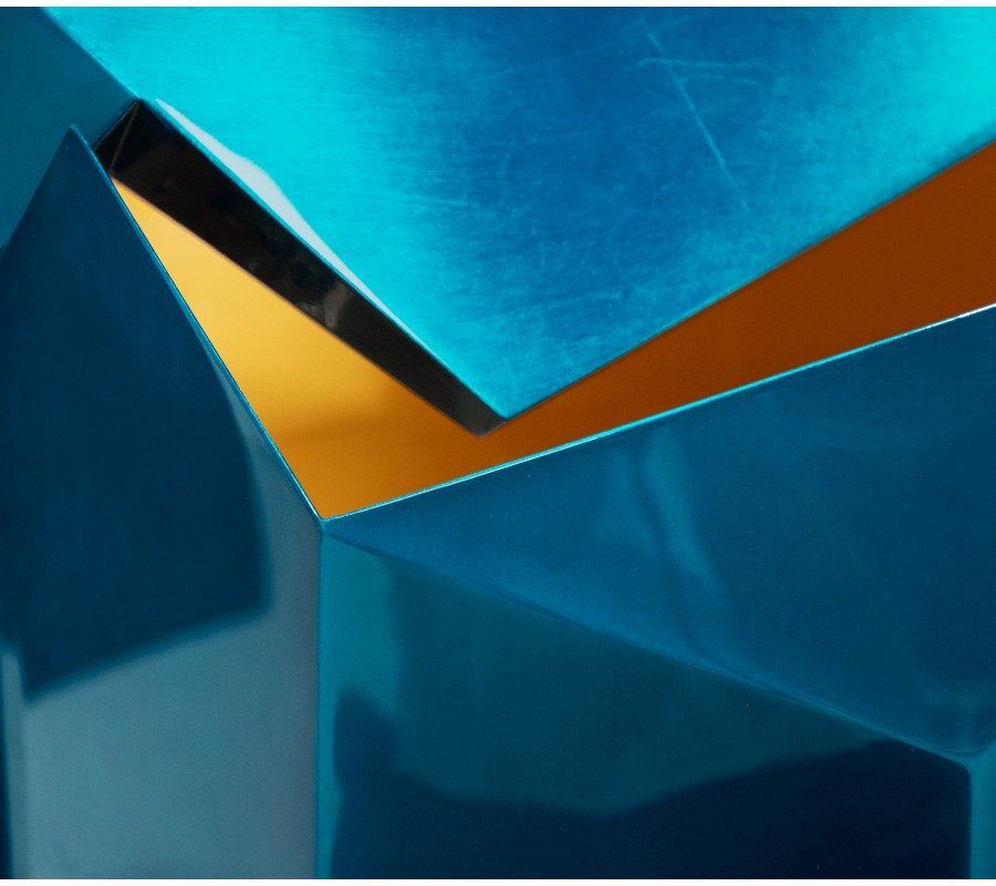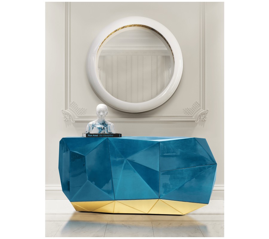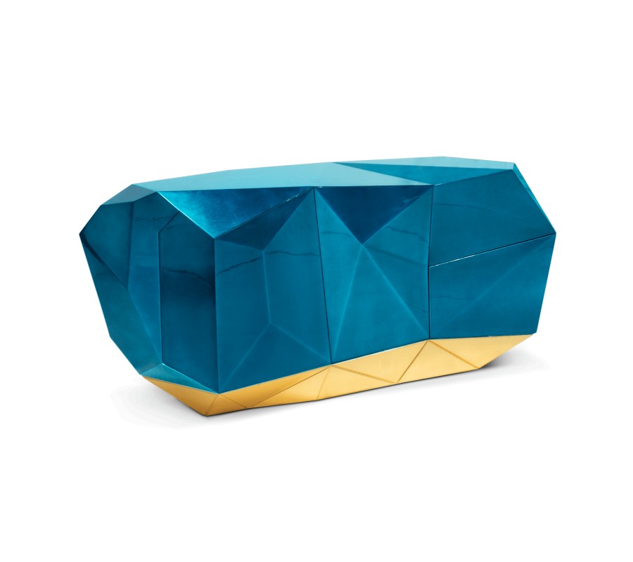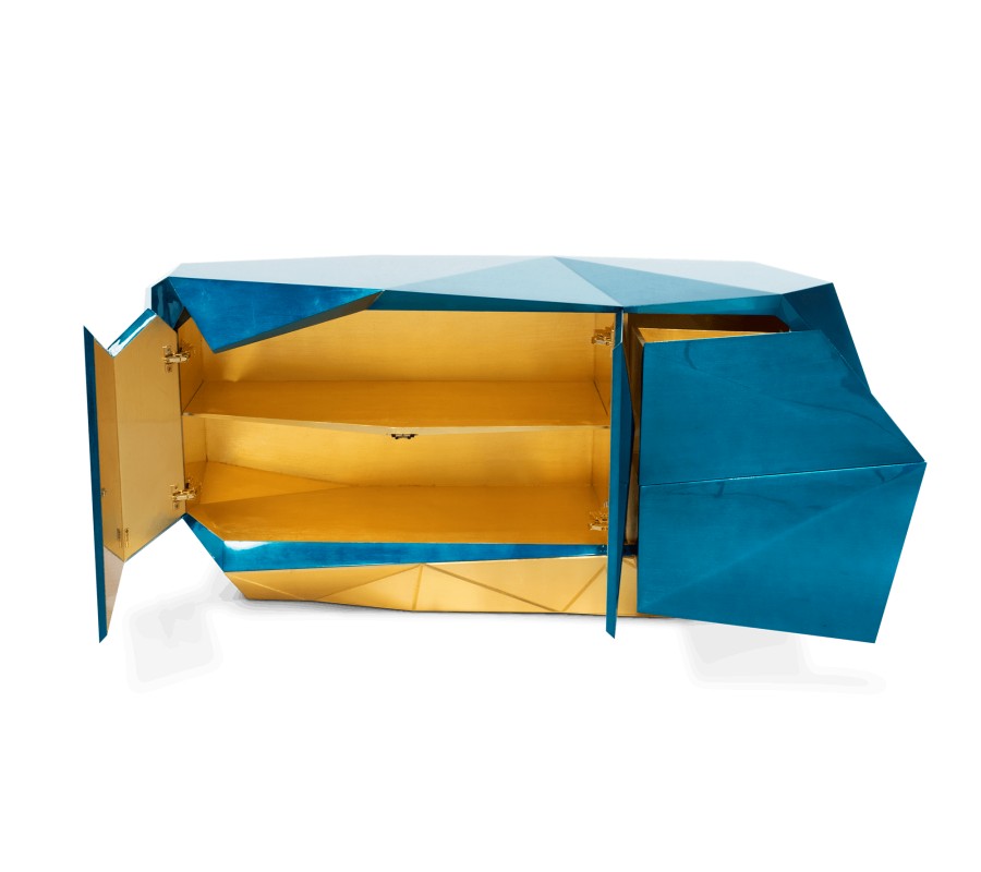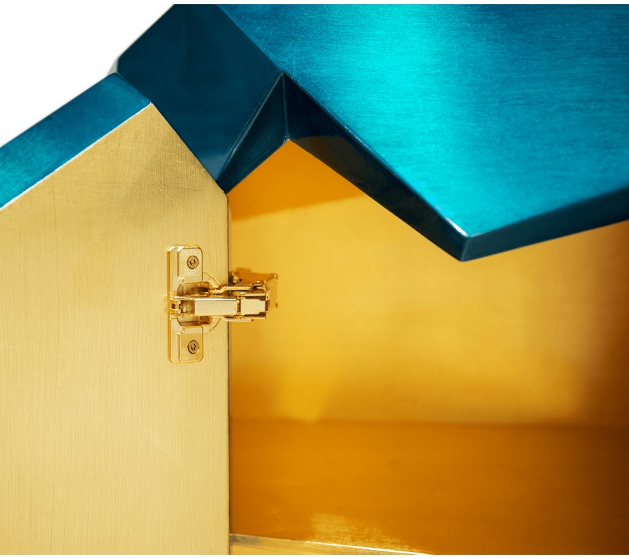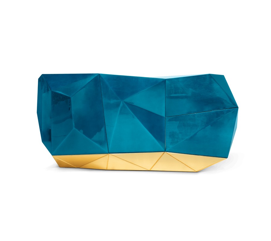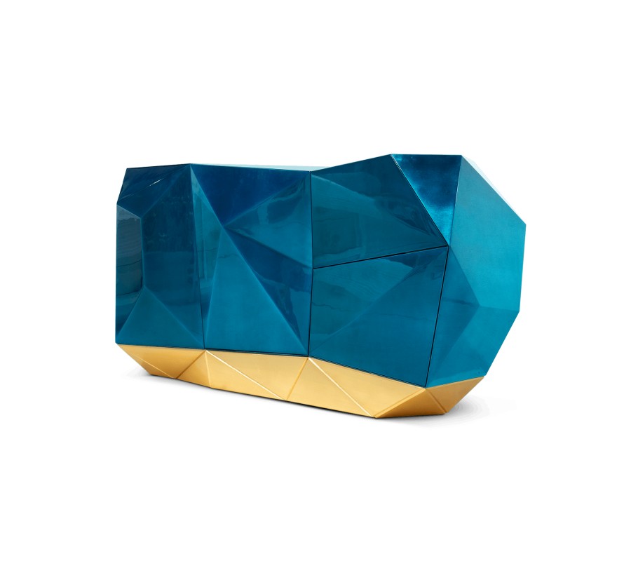 Luxusný príborník Diamond Blue odráža kvintesenciu popredného portugalského nábytkárskeho klenotníka. Príborník z dreveného masívu inšpirovaný gotickým nábytkom z obdobia romantizmu disponuje priestrannou vrchnou doskou. Vďaka asymetrickým bokom príborníka v štýle art-deco pripomínajúcemu najžiadanejší šperkársky drahokam vyniknú v závislosti od dopadu svetla hlboké odtiene kobaltovej modrej. Moderný príborník skrýva za nenápadnými dvojkrídlovými dvierkami a párom zásuviek bohatý úložný priestor. Ten je precízne zdobený exkluzívnou technikou ukladaním plátkového zlata. Pozlacovacia technika je použitá aj na masívnu podstavu, ktorú dozdobuje ručne vyrezávaný detail. Extravaganicia a luxus príborníka vyniknú najmä v interiéroch bohatých na svetlo, ktoré na dizajnovom príborníku predvedie unikátnu hru a odhalí každé zákutia modrej evokujúcej dynamiku oceánu. Príborník z kolekcie Diamond Blue odporúčame kobminovať s ďalším nábytkom v art-deco štýle a zlatými dekoráciami reflektujúcimi detaily príborníka.