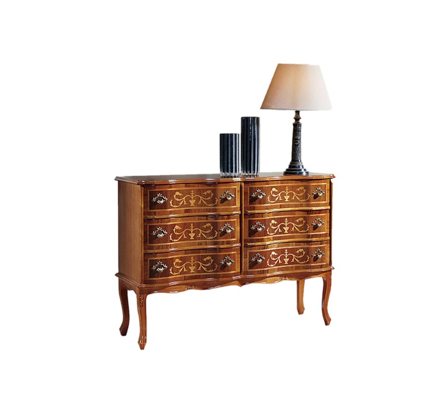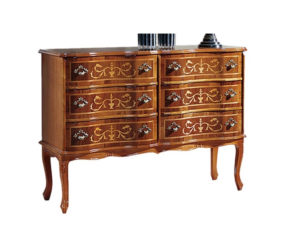 Luxusná komoda Clásica zaujme vďaka svojmu kvalitnému prevedeniu a bohatému rustikálnemu zdobeniu. Predstavuje kombináciu elegantných oblých línií a masívneho dreva, čím vzniká jedinečný súlad vhodný predovšetkým do klasicky a koloniálne ladených priestorov. Komoda poskytuje úložný priestor v podobe šiestich zásuviek, ktoré zdobia nádherné ručné ornamenty vytvorené technikou intarzie, a ozdobné kovové rukoväte. Rustikálny vzhľad dopĺňa aj precízne vyrezávanie a zaoblené nožičky, vďaka ktorým komoda dostáva nezameniteľný starožitný vzhľad. Komoda Clásica vynikne najmä v luxusných rustikálne či klasick ladených spálňach, kde ju možno vhodne kombinovať napríklad s čalúnenou posteľou s chesterfield prešívaním. Odporúčame taktiež kombináciu s ďalším nábytkom z našej kolekcie Clásica!