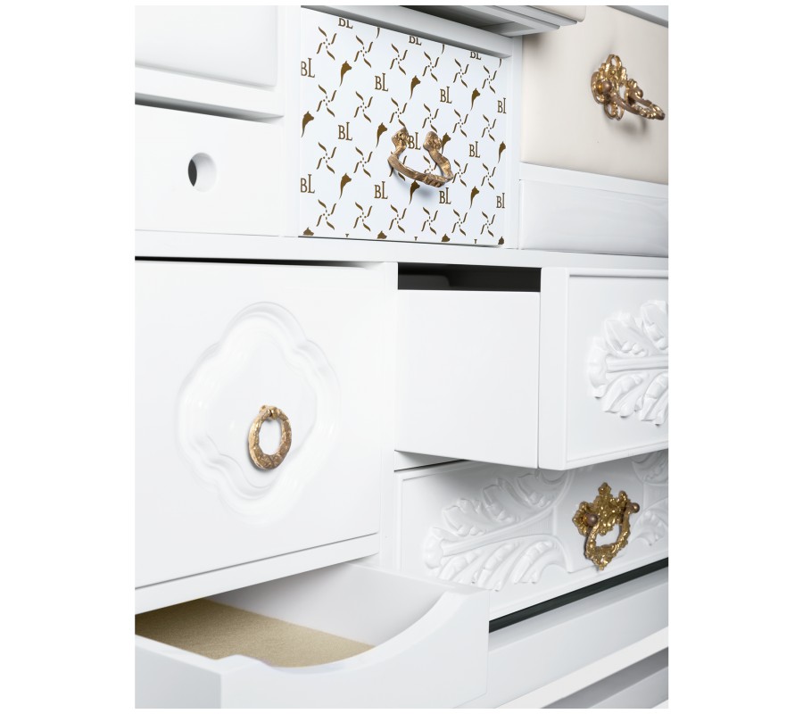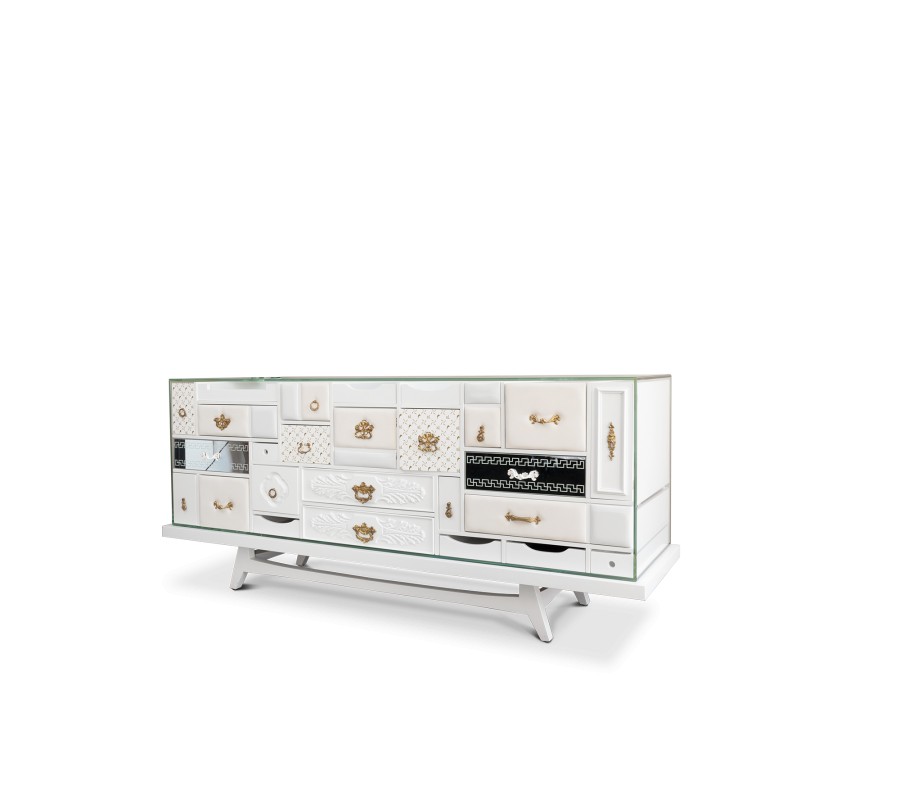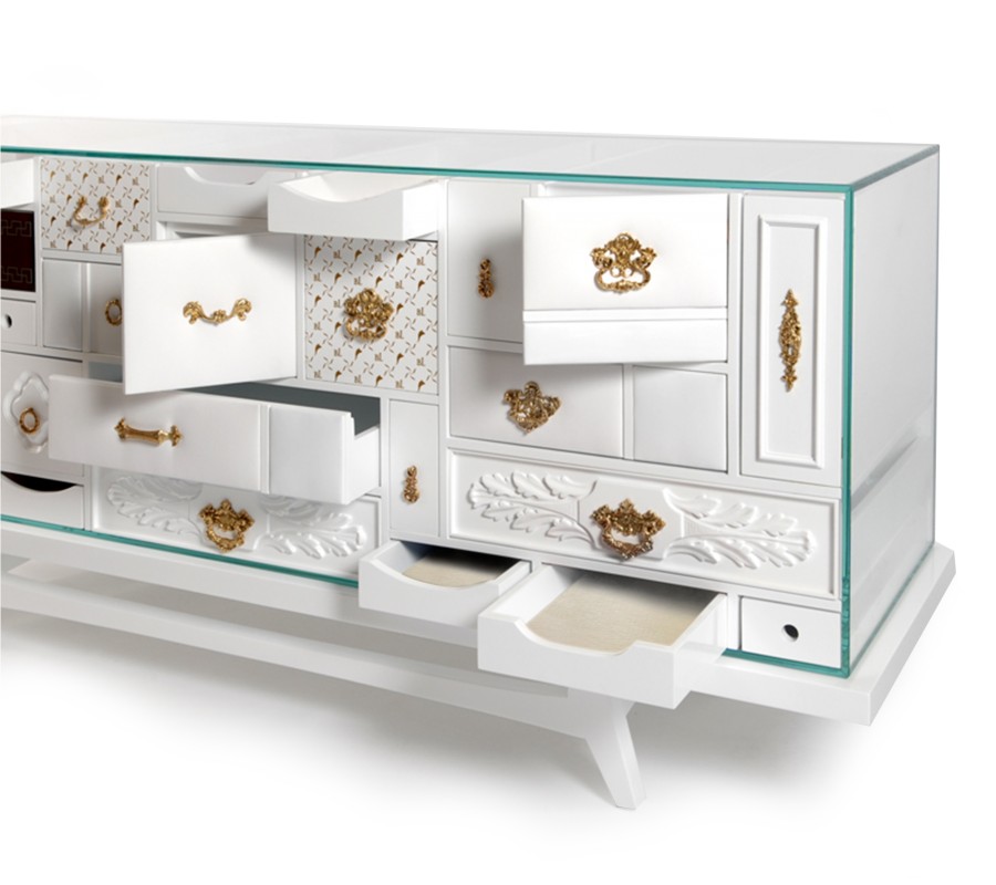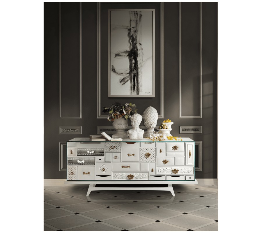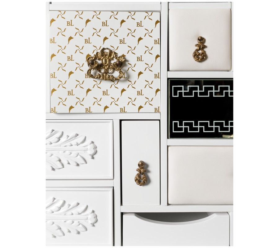 Keď sa umenie stane výnimočným kusom nábytku, interiéry získajú svetovú atmosféru moderného štýlu. Exkluzívna komoda Mondrian, vnímaná ako zberateľský kúsok, sa rodí z geometrických línií a je nepredvídateľne spárovaná so štýlovými detailmi. Moderná komoda Mondrian má masívnu mahagónovú konštrukciu jemne spojenú s elegantným rámom z tvrdeného skla. Pozostáva zo sady zásuviek a dvierok s rôznymi štýlmi, od vyrezávaných detailov vo vysokolesklom prevedení, cez zrkadlá a brúsené sklo až po sofistikované kožené detaily zakončené elegantnými mosadznými úchytkami s klasickými tvarmi a kryštálmi. Jemnejšie odtiene bielej a zlatej prinášajú pocit la dolce vita, vrodený zmysel pre nadčasový interiérový dizajn. Luxusnú masívnu komodu Mondrian odporúčame kombinovať s nábytkom rovnakej kolekcie, art-deco nábytkom, ale aj kolekciami Soho, Melrose, Brooklyn či York.