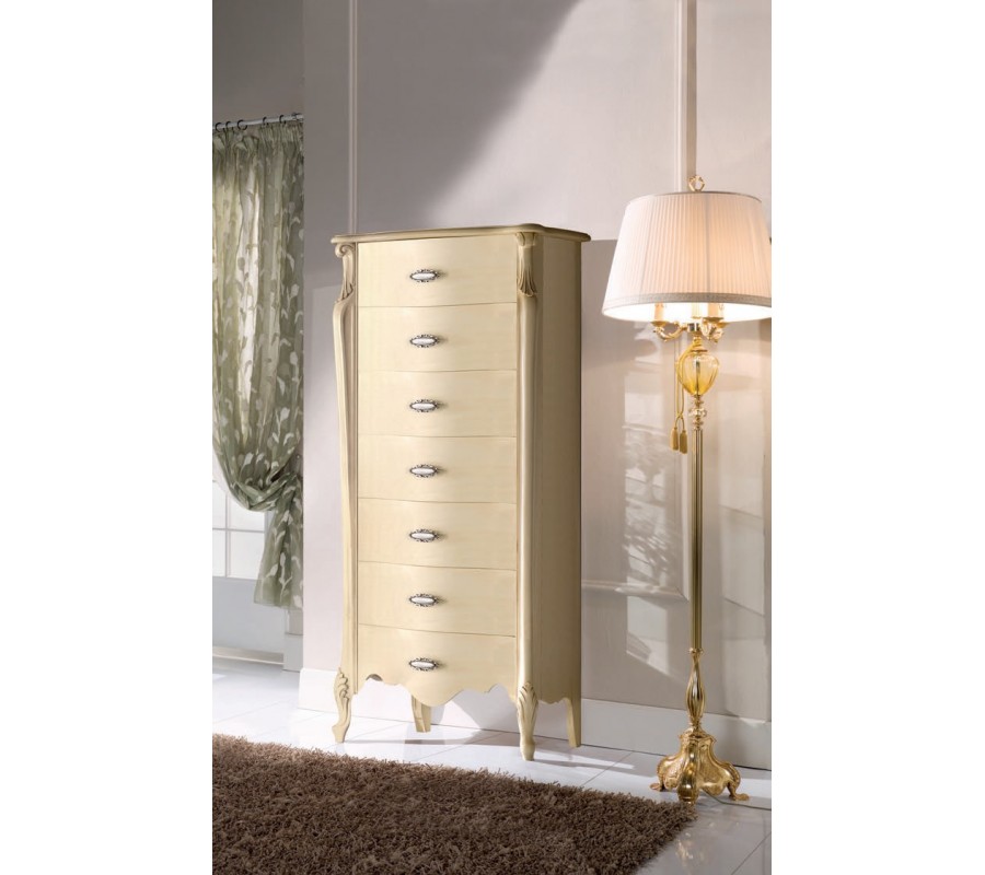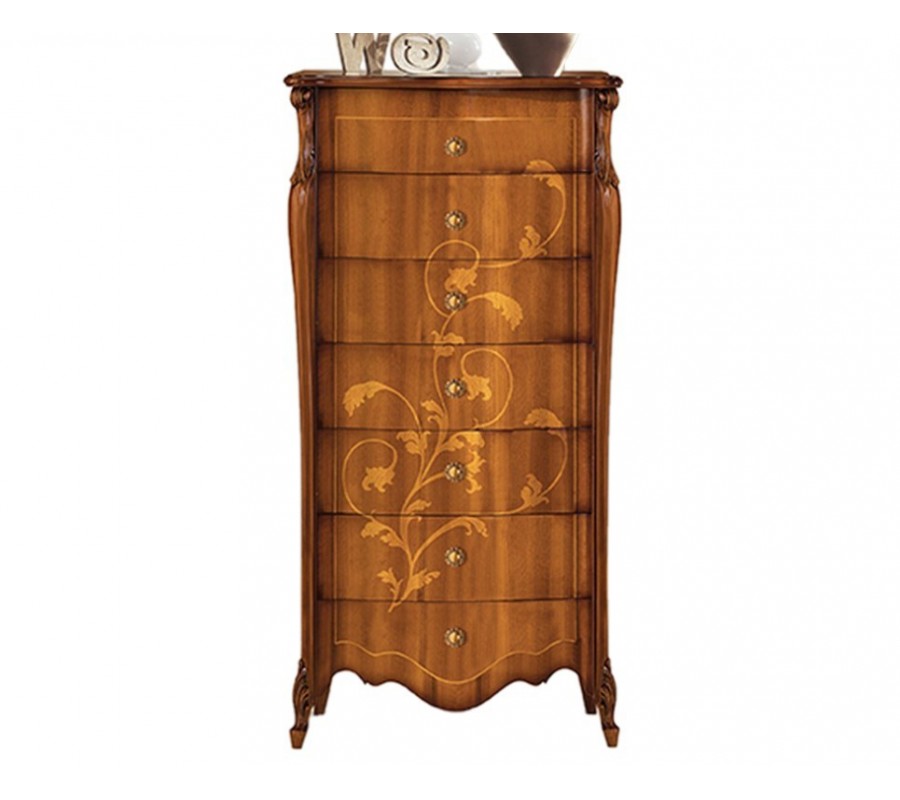 Luxusná vysoká komoda z našej kolekcie talianskeho masívneho nábytku Pasiones sa vyznačuje predovšetkým svojím nádherným dizajnovým prevedením a jemnými zaoblenými líniami pripomínajúce barokový štýl. Komoda z kvalitného masívneho dreva je zdobená jemnou florálnou intarziou a ručne vyrezávanými detailami. Na výber ponúkame viacero možných farebných prevedení dreva, vďaka čomu komoda bez problémov zapadne do vášho interiéru. Dostupné prevedenia si môžete pozrieť v priloženom vzorkovníku. Komoda disponuje siedmimi zásuvkami, vďaka čomu je ideálnym adeptom na uskladnenie oblečenia v spálni alebo dokumentov v luxusných kanceláriách. Celkový rustikálny vzhľad dotvárajú aj kovové úchyty na zásuvkách, vyrezávané nožičky v štýle chippendale a ozdobné vyrezávanie. Komoda Pasiones vynikne najmä v klasicky či rustikálne ladených interiéroch. Odporúčame ju kombinovať s masívnou knižnicou či toaletným stolíkom a čalúneným kreslom alebo posteľou.