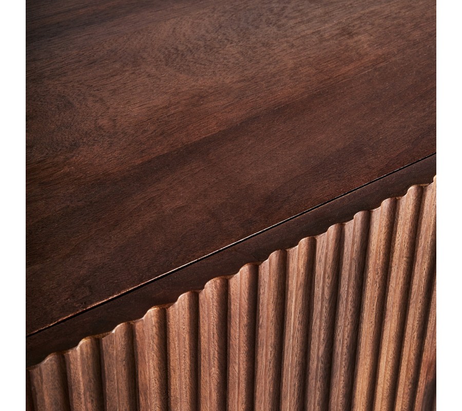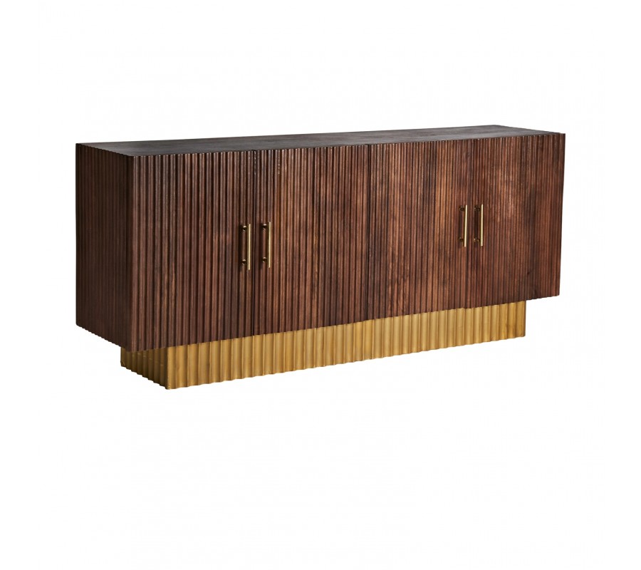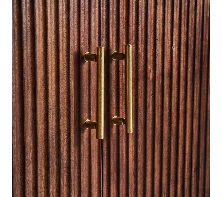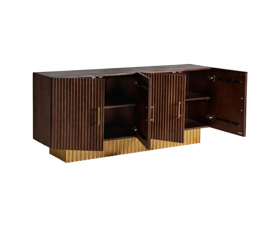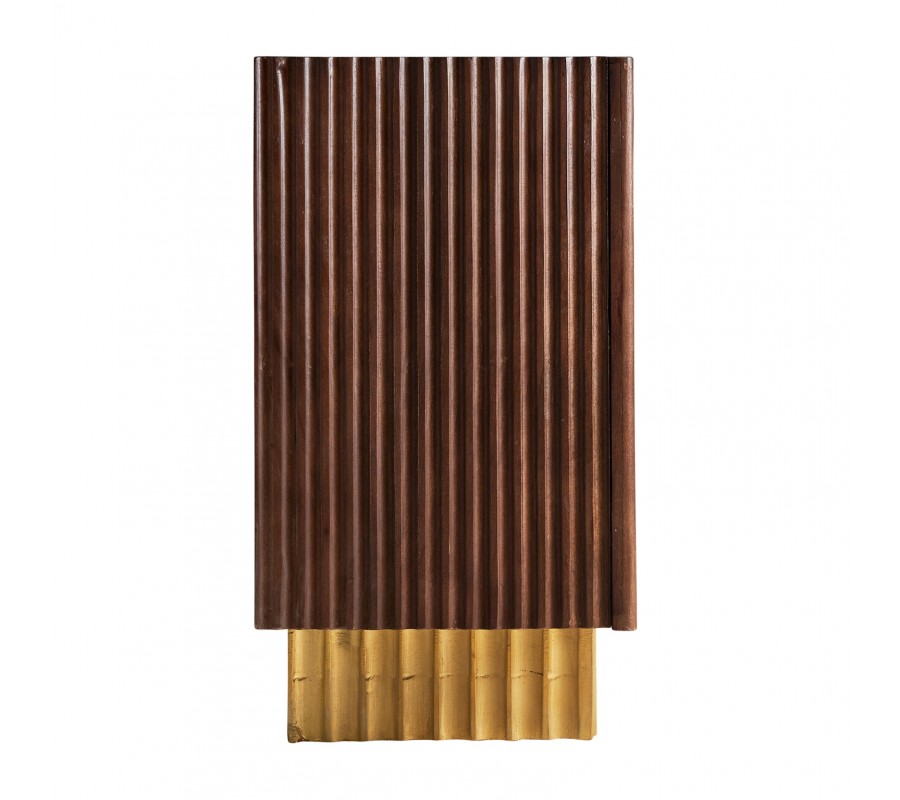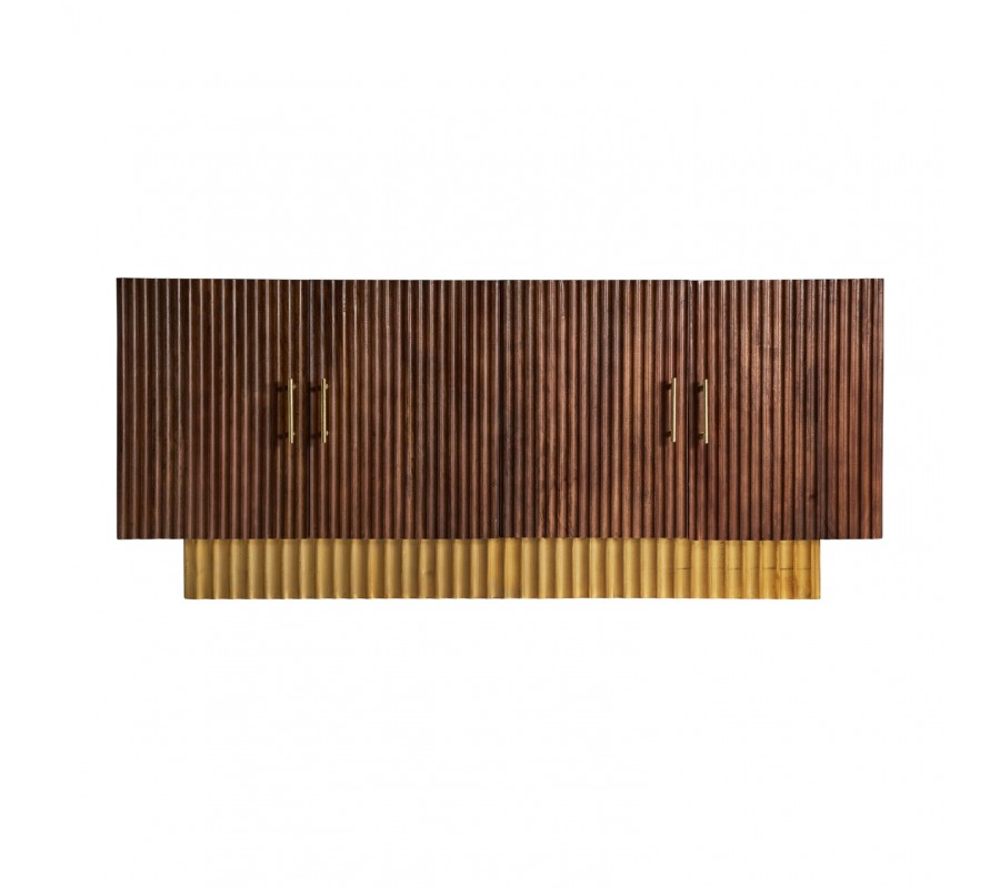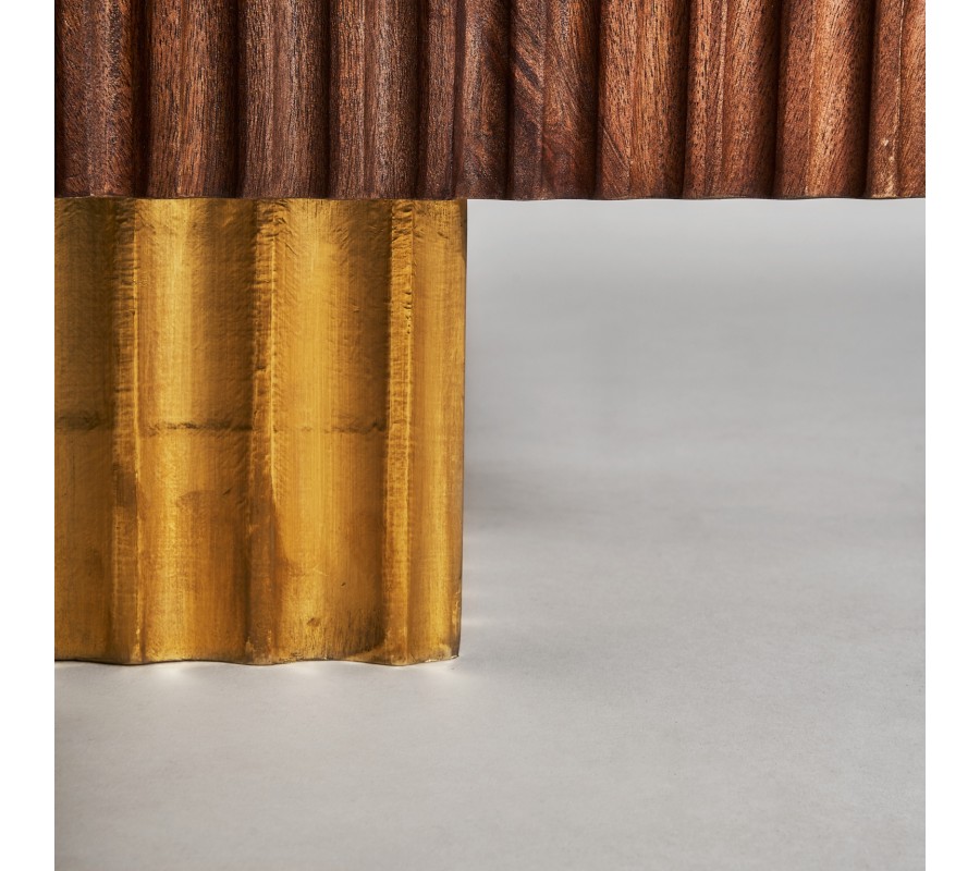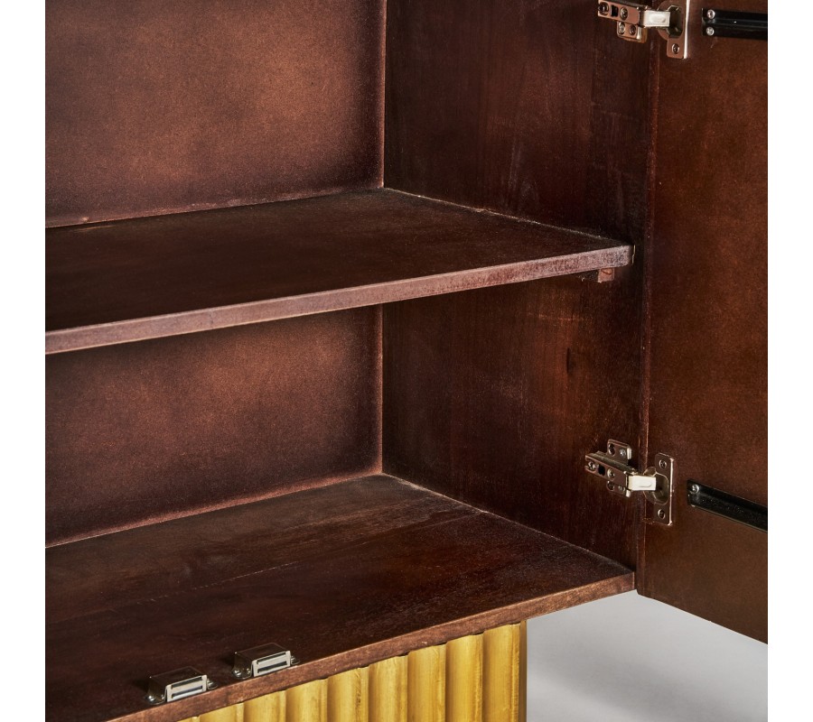 Luxusná komoda do spálne z kolekcie Mesia predstavuje typicky vyrezávaný nábytok, ktorý odráža oslavy života a luxusu medzivojnového obdobia. Tento luxus sa odráža aj na netypickom výbere dreva. Mangové drevo, z ktorého je komoda vyrobená sa vyznačuje svojou mäkosťou a jemnou kresbou. Exkluzívna komoda disponuje dvoma dvierkami bohatého úložného priestoru. Vďaka pre art-deco typickým vyrezávaním podstavou v zlatej farbe táto dizajnová komoda predstavuje elegantný kúsok, ktorý dodá Vašej spálni dotyk luxusu. Pozornosti neuniknú ani dizajnové úchytky, ktoré zdôraznia vertikálne línie celej komody. Neobyčajná komoda sa vďaka svojmu farebnému prevedeniu v teplých tónoch hodí do rovnako ladených interiérov. Zjemní aj výraznejšie tapety typické pre art-deco štýl a skvelo ju doplnia ďalšie kúsky v modernom art-deco štýle či zlaté detaily.