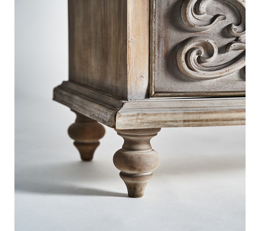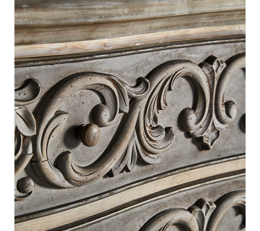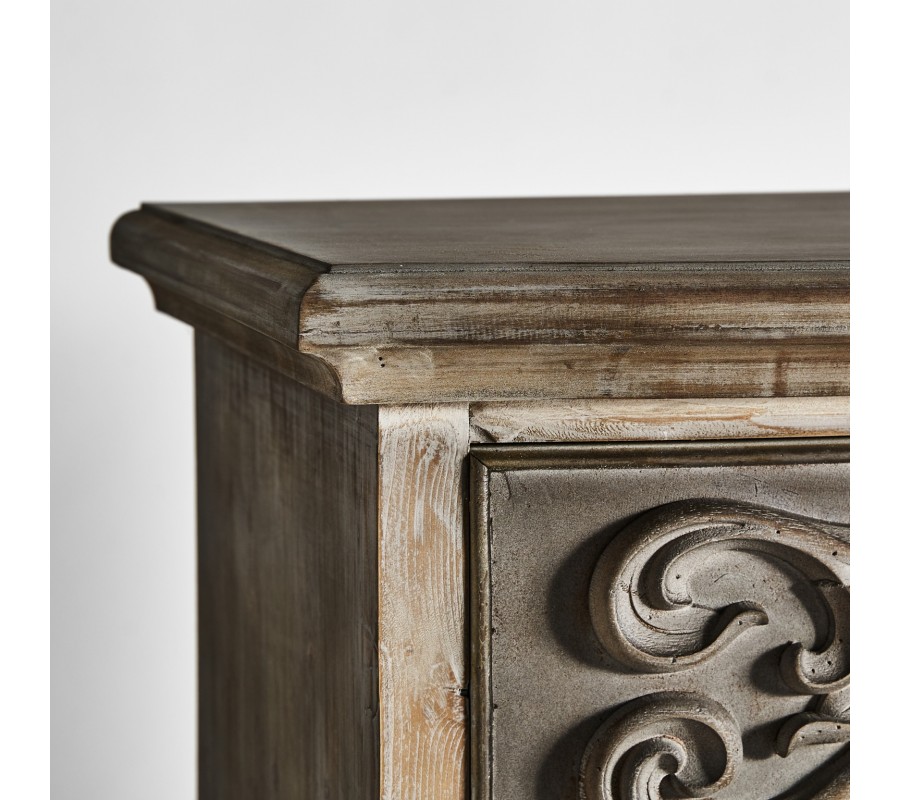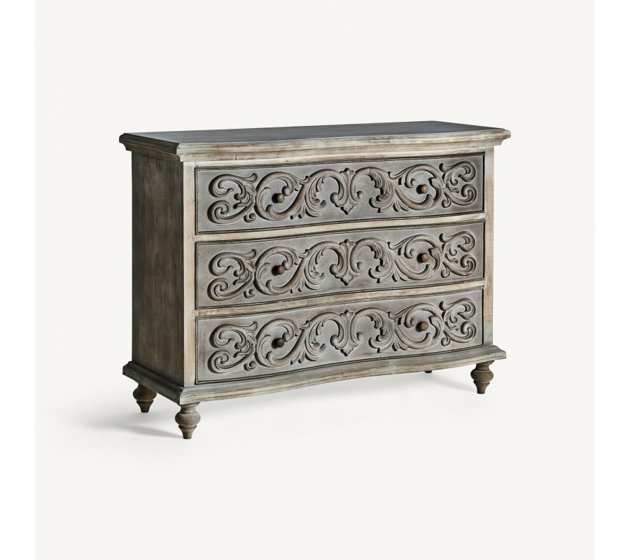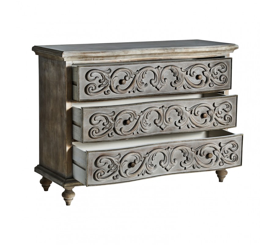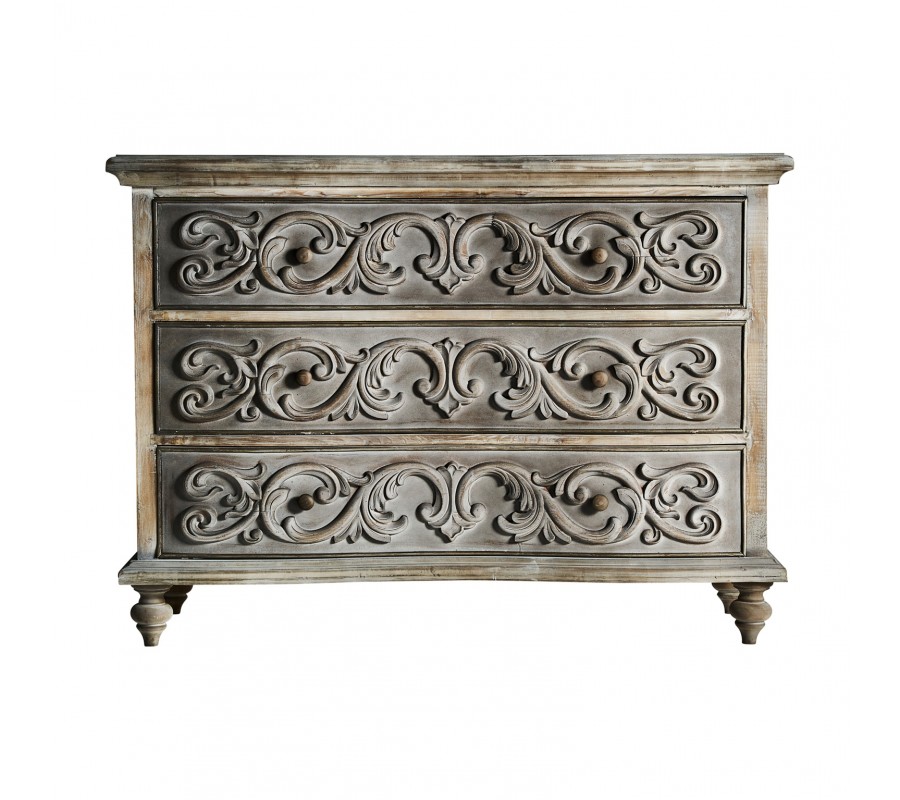 Rustikálna masívna komoda Deborah do spálne s tromi zásuvkami s florálnym vyrezávaním 124cm
