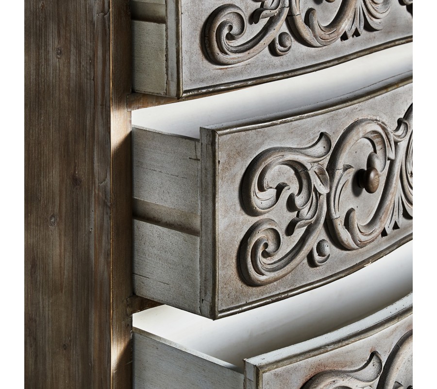 Luxusná komoda Deborah je unikátnym kúskom, ktorý u vás doma vyčarí nezameniteľný rustikálny nádych. Komoda sa pýši telom z kvalitného masívneho jedľového dreva v prírodnej hnedosivej farbe so starožitne pôsobiacou patinou. Disponuje tromi priestrannými zásuvkami, ktoré zdobia nádherné vyrezávané ornamenty. Precízne vyrezávané su aj drobné nožičky dotvárajúce celkový vintage nádych. Komoda Deborah zapadne do rustikálne a vintage ladených priestorov v kombinácii s ďalšími masívnymi kúskami. Možno ju tiež vkusne kombinovať s doplnkami z prírodných materiálov v naturálnych farbách.
