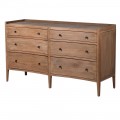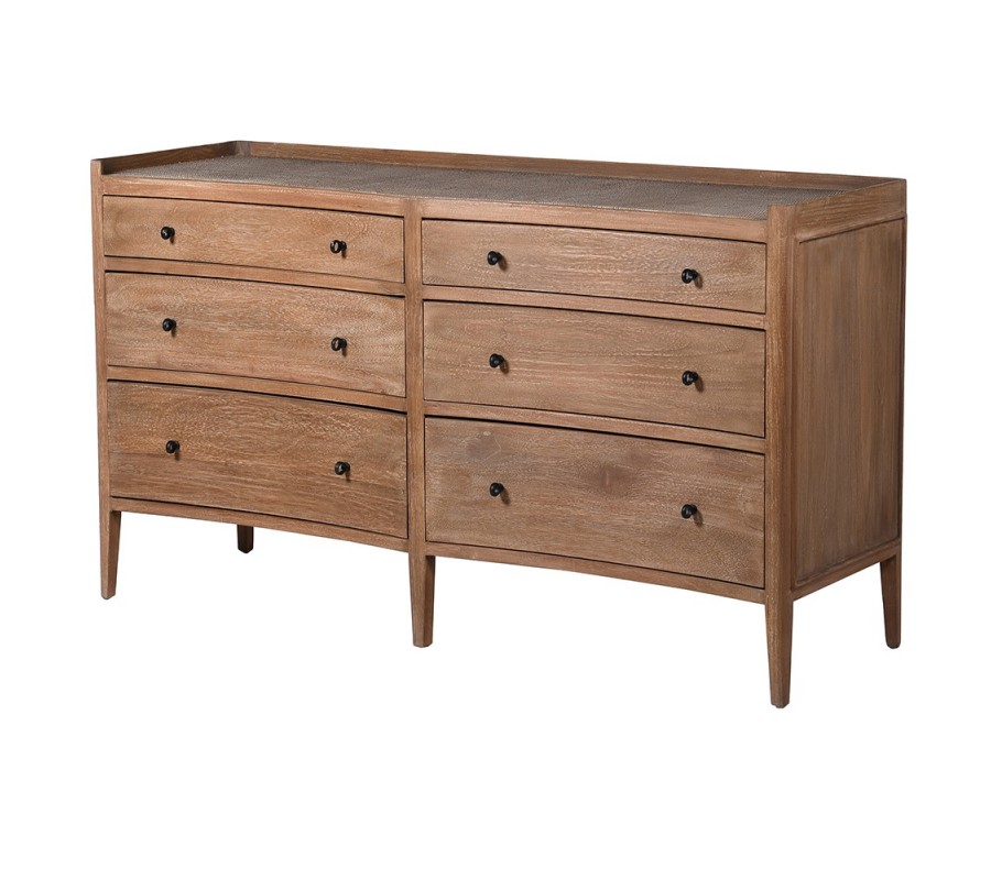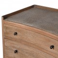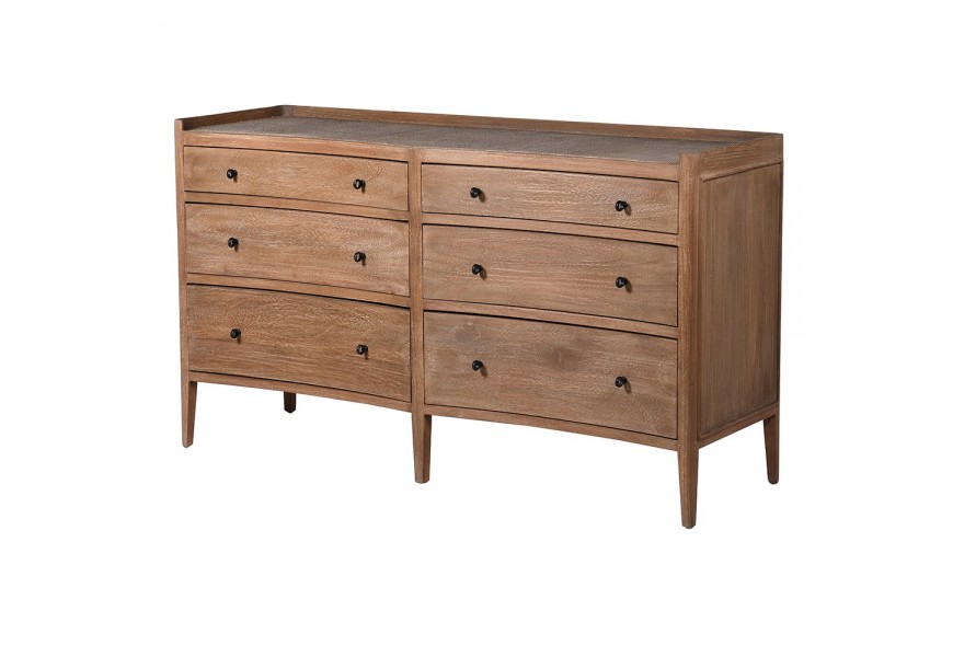 Komoda Barbados v obdĺžnikovom tvare z masívneho dreva vás očarí svojími ladnými oblými krivkami, kvalitným dreveným vyhotovením a dizajnovými detailmi, ktoré dotvárajú celkový vzhľad tohto produktu. Komoda v prvom rade disponuje vrchnou doskou s trstinovým výpletom, pripomínajúcim ratan. Kvalitný masív v naturálnej hnedej farbe s prírodnou povrchovou úpravou je doplnený vyrezávaním v tvare štvorca na svojej bočnej strane. Luxusná komoda Barbados disponuje troma pármi zásuviek s čiernymi kruhovými rukoväťami, pričom rozmer zásuviek sa zostupne zväčšuje, čo v kombinácií so zaobleným tvarom komody vytvára atypický, no zároveň pôvabný dizajn. Unikátne dizajnové vyhotovenie komody Barbados odporúčame kombinovať do interiérov v kombinácií s prírodne hnedým masívnym nábytkom a s nábytkom s podobnými oblými tvarmi v rustikálnom alebo vidieckom štýle, a taktiež sa hodí ako nábytok do spálne v drevenom zrube.