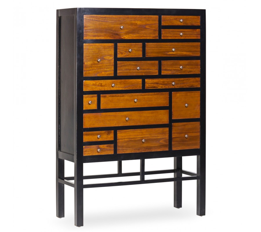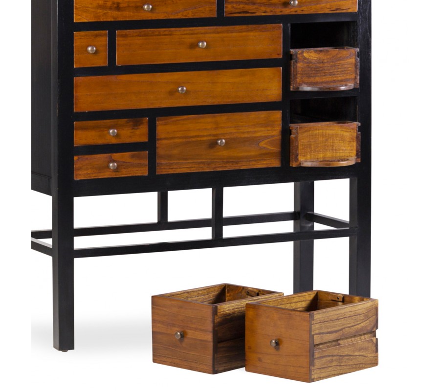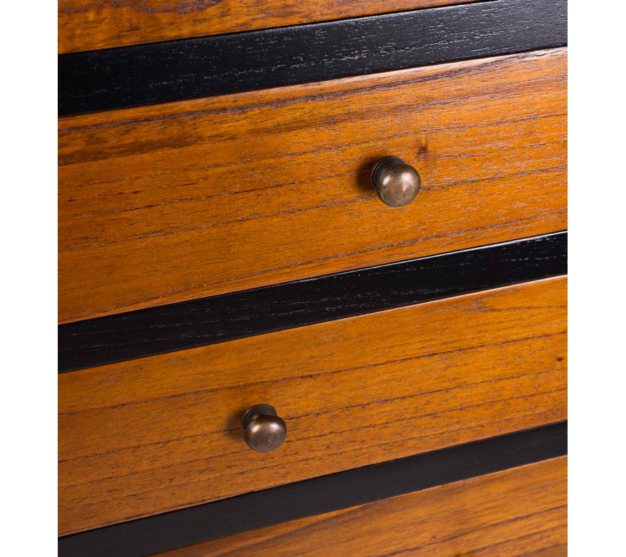 Masívna koloniálna komoda Julio s čiernou konštrukciou a hnedými asymetrickými zásuvkami z kvalitného dreva mindi 145cm